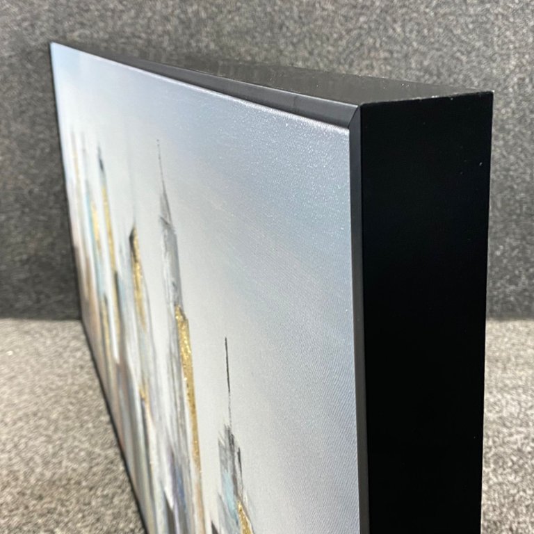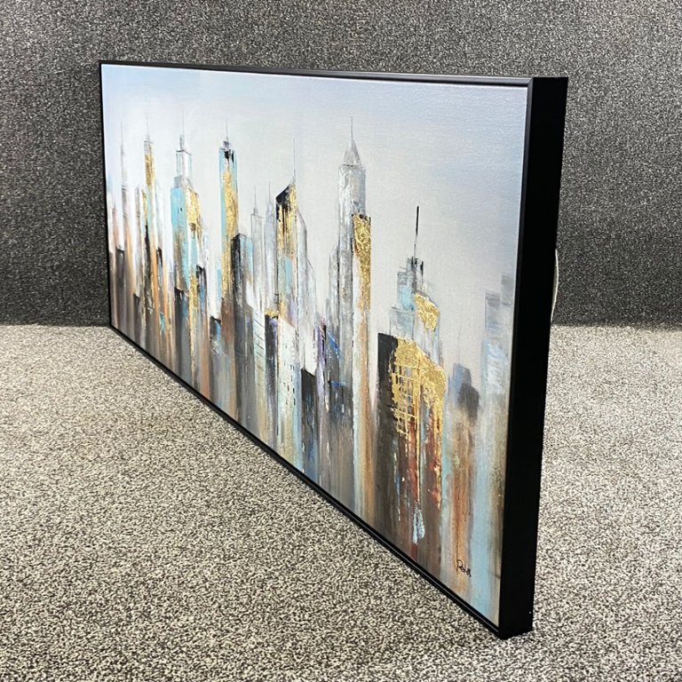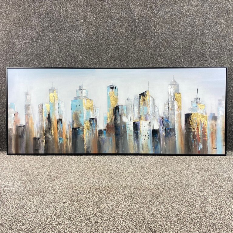 Dive into the majestic cityscape depicted in "City Towers," an evocative oil painting by the artist Peter. Encased in a sleek black frame, this captivating artwork measures 24 inches in height and an expansive 60 inches in width, commanding attention and admiration wherever it is displayed.