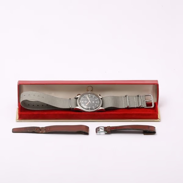 A manual-winding movement powers the watch, showcasing Omega’s renowned precision and craftsmanship from the era. The original grey fabric strap complements the utilitarian design, while the inclusion of a leather strap adds versatility, allowing the wearer to adapt the watch to different occasions or styles.