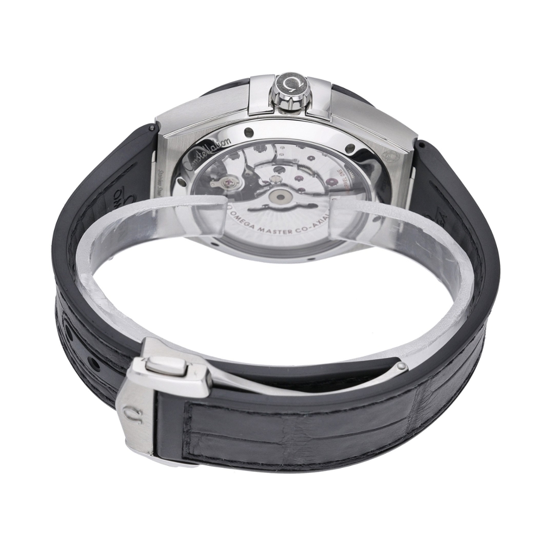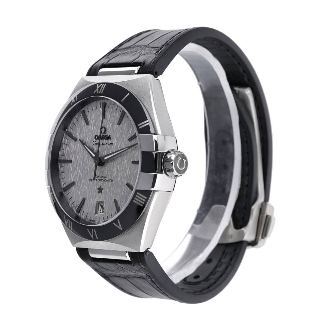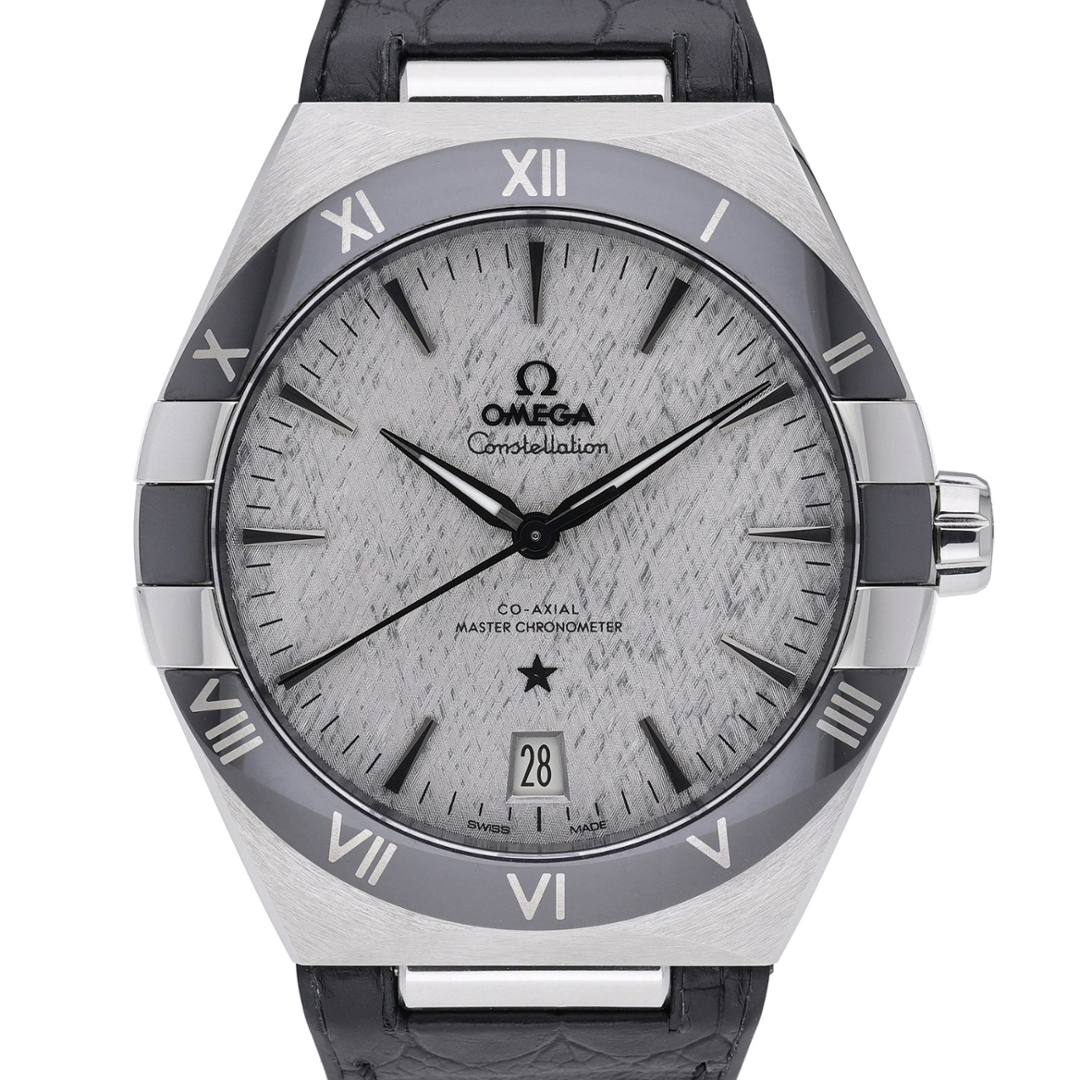 An Omega Constellation, reference 131.33.41.21.06.001, is a modern interpretation of one of Omega’s most celebrated collections. Featuring a 41mm stainless steel case with the signature half-moon facets and “claws” at 3 and 9 o’clock, this watch combines strong architectural lines with timeless refinement. The grey dial, with its textured finish, offers a distinctive look enhanced by applied indices, luminous hands, and a date display at 6 o’clock. A black ceramic bezel with engraved Roman numerals adds both contrast and durability, while the black leather strap and steel clasp complete the sophisticated design.