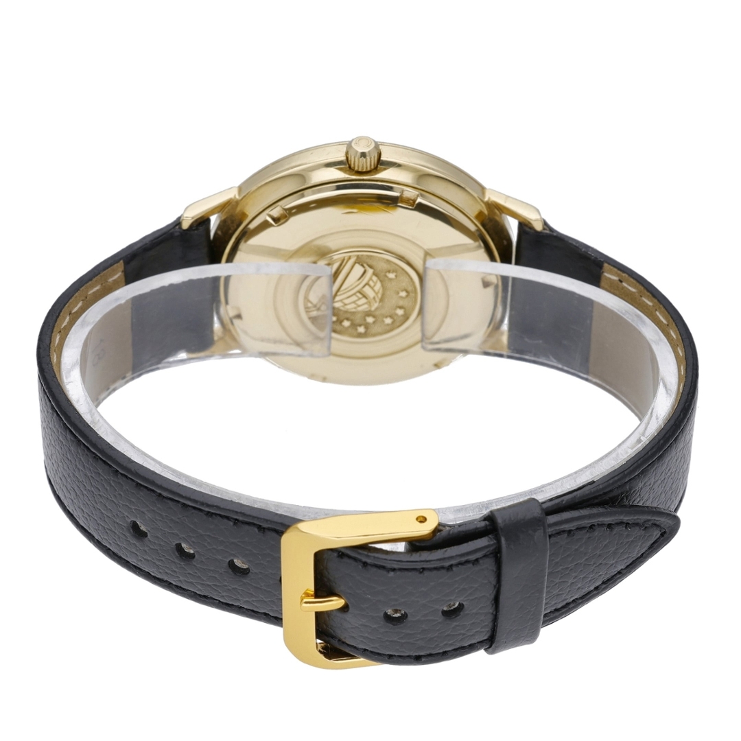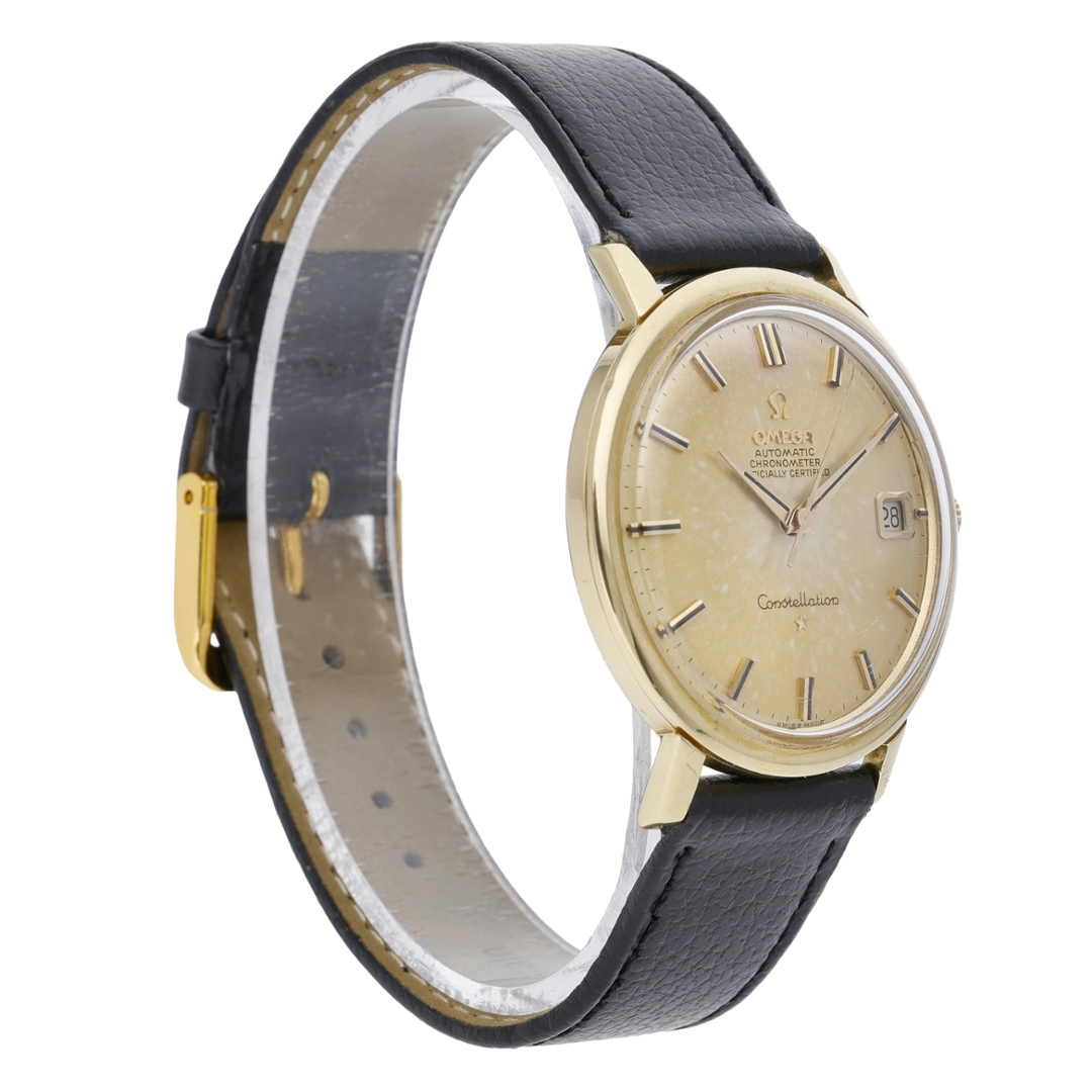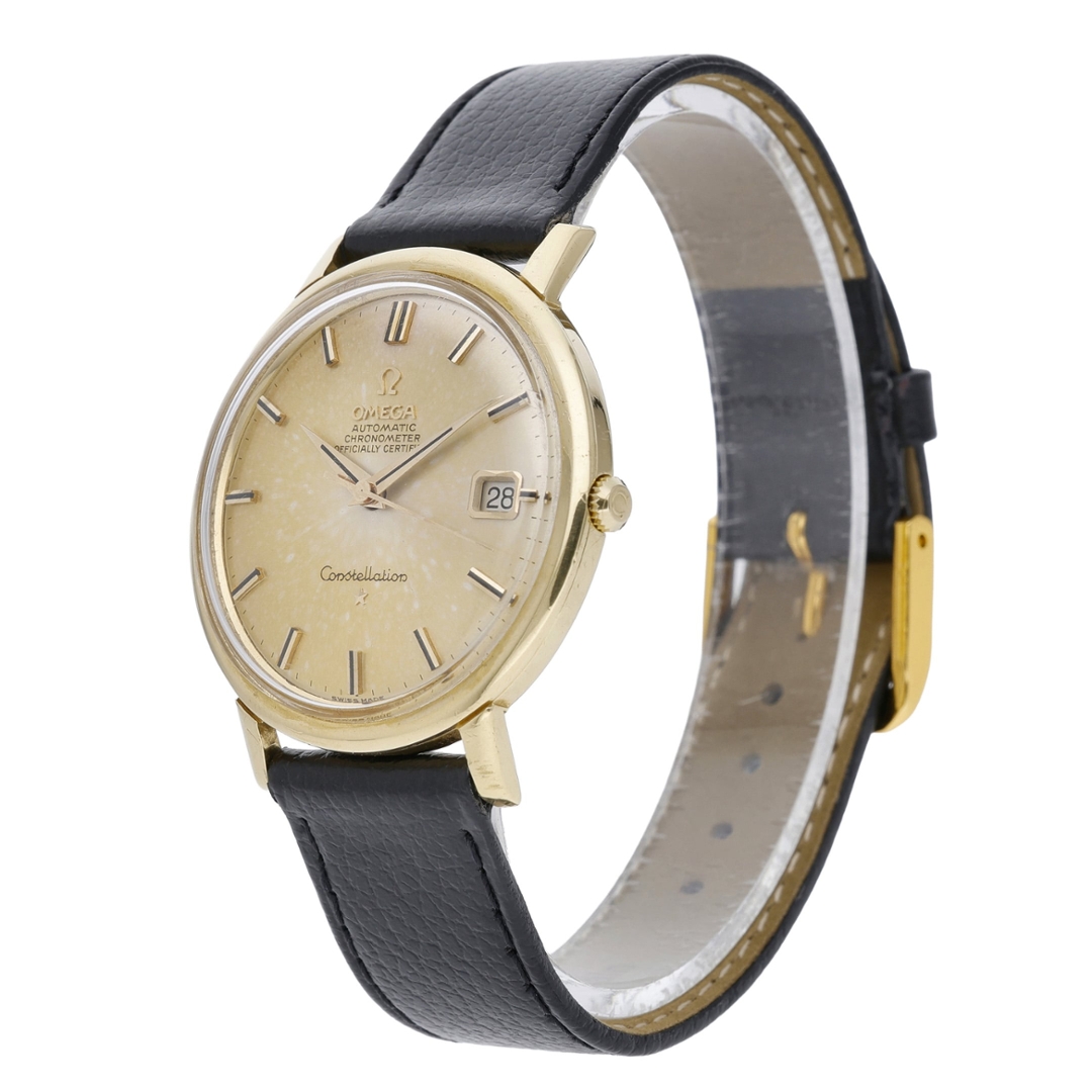 An Omega Constellation Watch from 1962, presented in vintage condition, showcases one of Omega’s most respected and historically significant dress watch lines. The 34mm 18ct yellow gold case offers a refined and elegant profile, paired with a black leather strap that complements the watch's warm tones. The golden dial displays a naturally aged patina, adding character and depth, while the applied baton hour markers and the date aperture maintain a clean, balanced aesthetic.