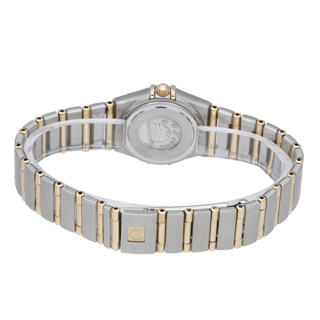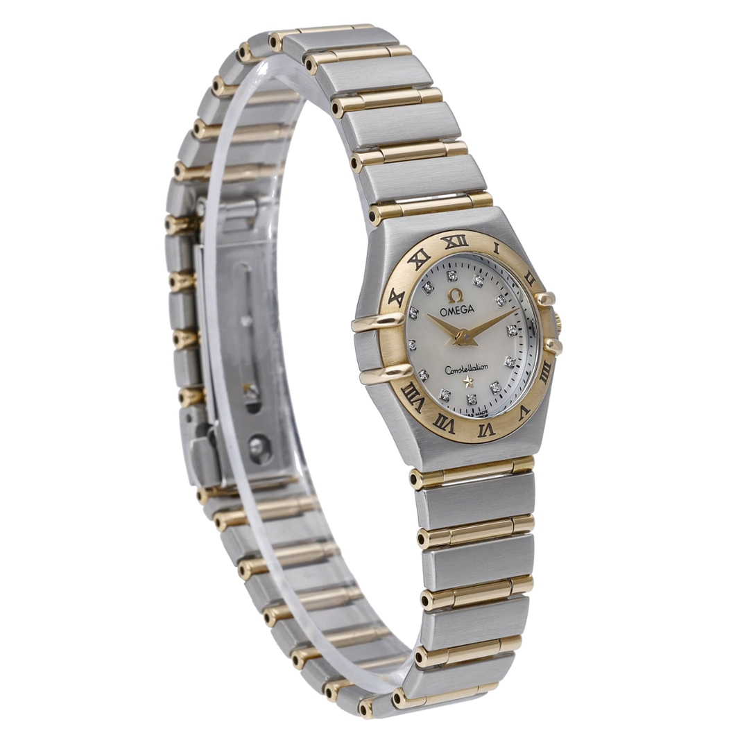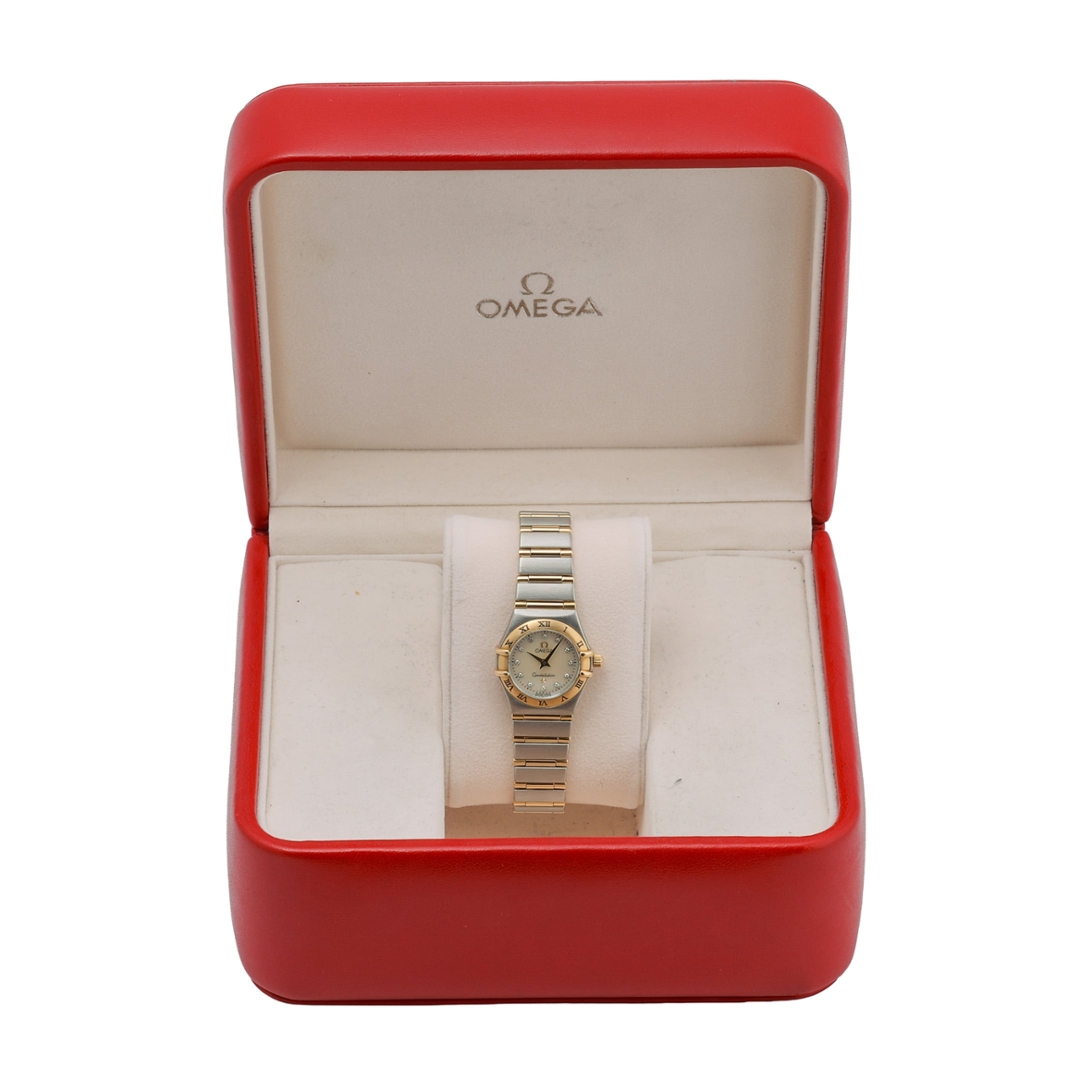 An Omega Constellation Watch in bi-metal stainless steel and 18ct yellow gold, presented in immaculate condition, showcasing a refined and elegant design within Omega’s iconic Constellation line. The 22mm case is complemented by the signature integrated bracelet, combining brushed steel with gold accents for a balanced and sophisticated wrist presence. The mother-of-pearl dial has been afterset with diamond hour markers, offering a bright, iridescent finish enhanced by added brilliance, while the classic Roman numeral bezel frames the dial beautifully.
