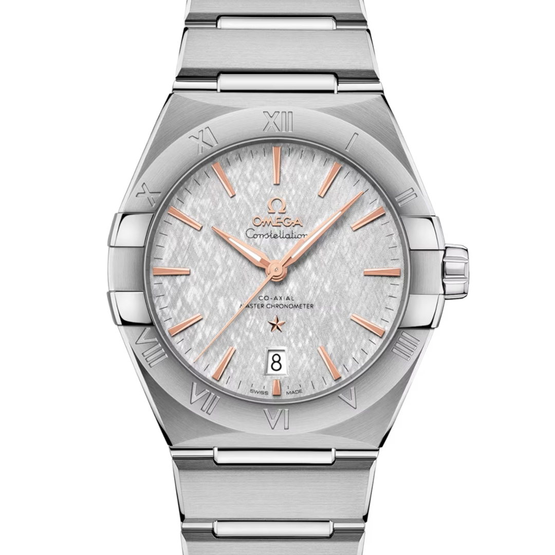 An Omega Constellation, crafted in stainless steel and distinguished by its textured grey dial and iconic integrated bracelet design. The 39mm case offers a balanced and contemporary presence, while the signature bezel engraved with Roman numerals and the characteristic “claws” at either side firmly establish its place within the Constellation lineage.