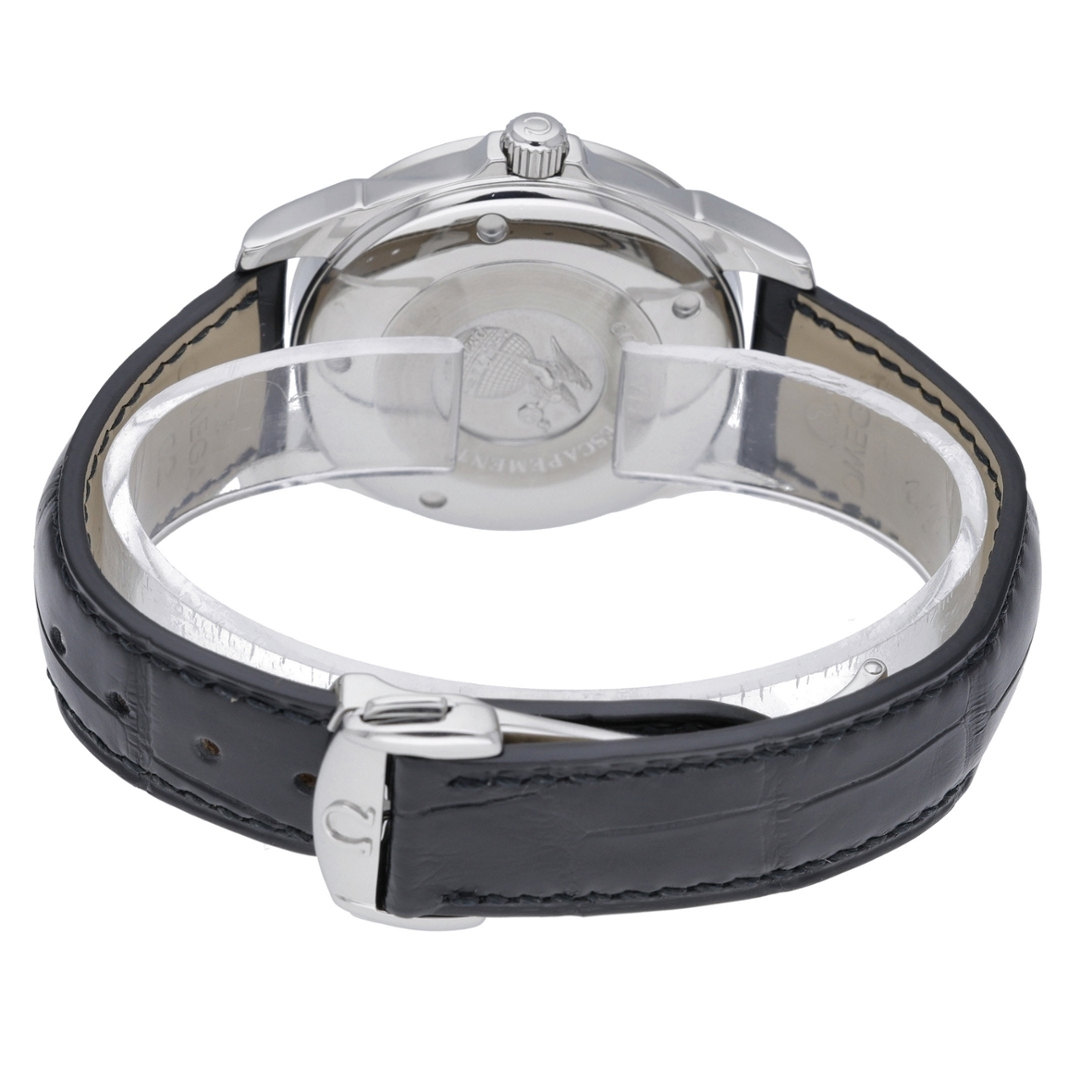 An Omega De Ville Co-Axial Watch, paired with a sleek black leather strap and completed by a stainless steel case and clasp on a striking black dial. Model 4831.50.31 from 2002: a classically styled De Ville that showcases Omega’s celebrated Co-Axial technology — a milestone movement known for its enhanced precision and long-term performance.