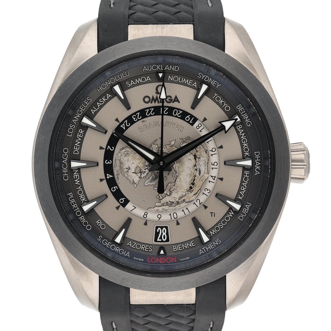 An Omega Seamaster Aqua Terra 150 M Worldtimer Watch, Black Rubber Strap with a Titanium Case & Clasp on a Grey Dial