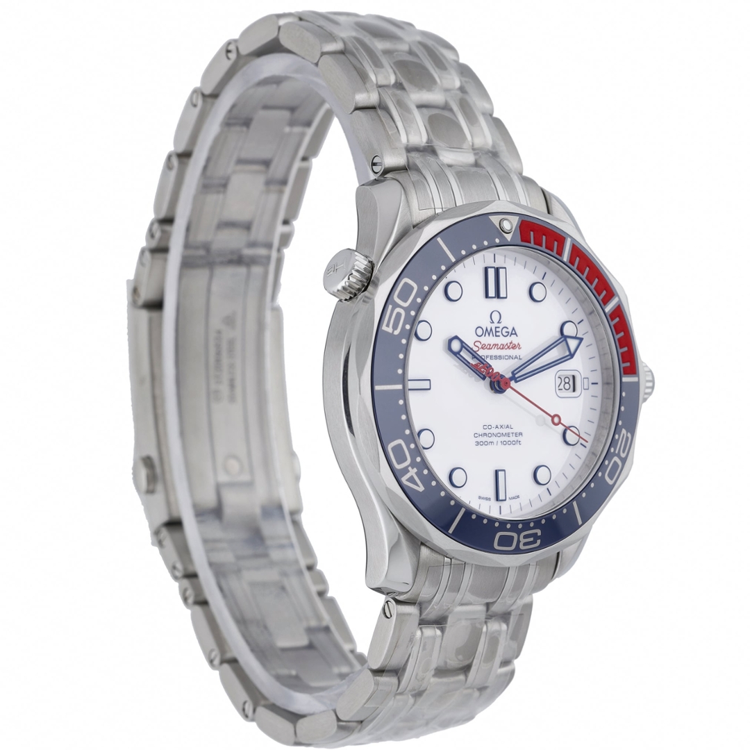 An Omega Seamaster Diver 300M is presented in stainless steel with a crisp white dial and a distinctive blue ceramic bezel with red dive-scale detailing. The 41mm case offers balanced proportions, while the steel bracelet provides a solid and versatile everyday wear.