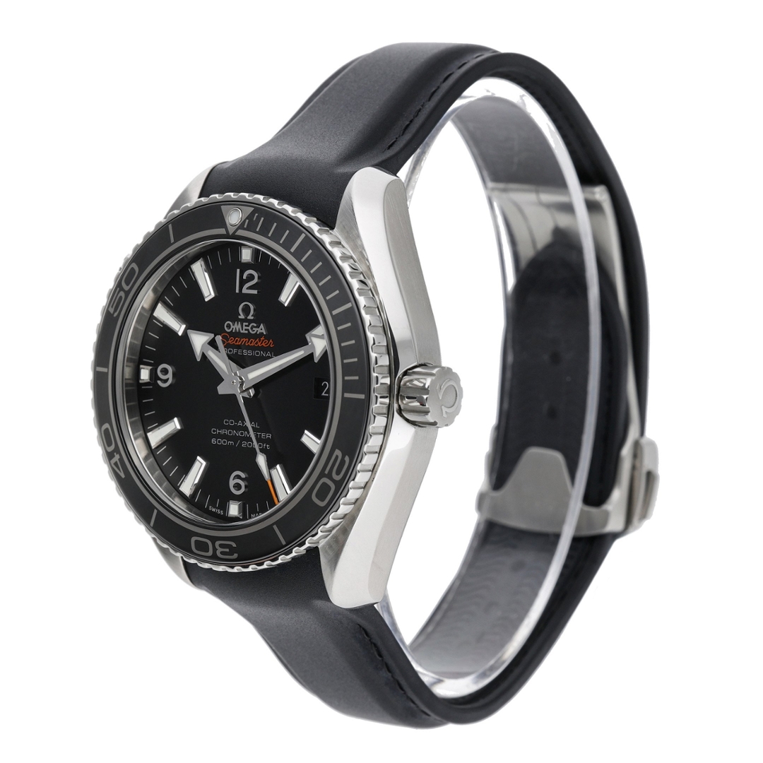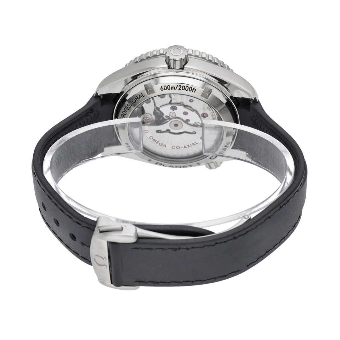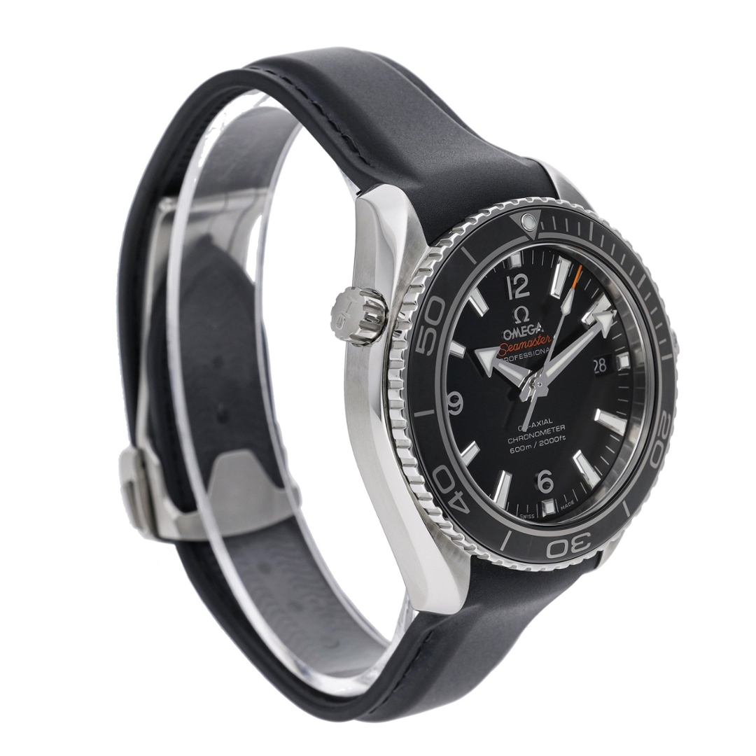 An Omega Seamaster Planet Ocean 600M, model 232.32.42.21.01.003, is a professional-grade dive watch that combines robust engineering with sleek design. This 2015 edition features a 42mm stainless steel case fitted with a black ceramic unidirectional bezel and a matching black dial with luminous hands and indexes for maximum legibility underwater. The watch is paired with a durable black rubber strap and stainless steel clasp, offering comfort alongside sport-ready functionality. Water resistant to an impressive 600 metres (2000 feet), it is built to meet the demands of serious diving.