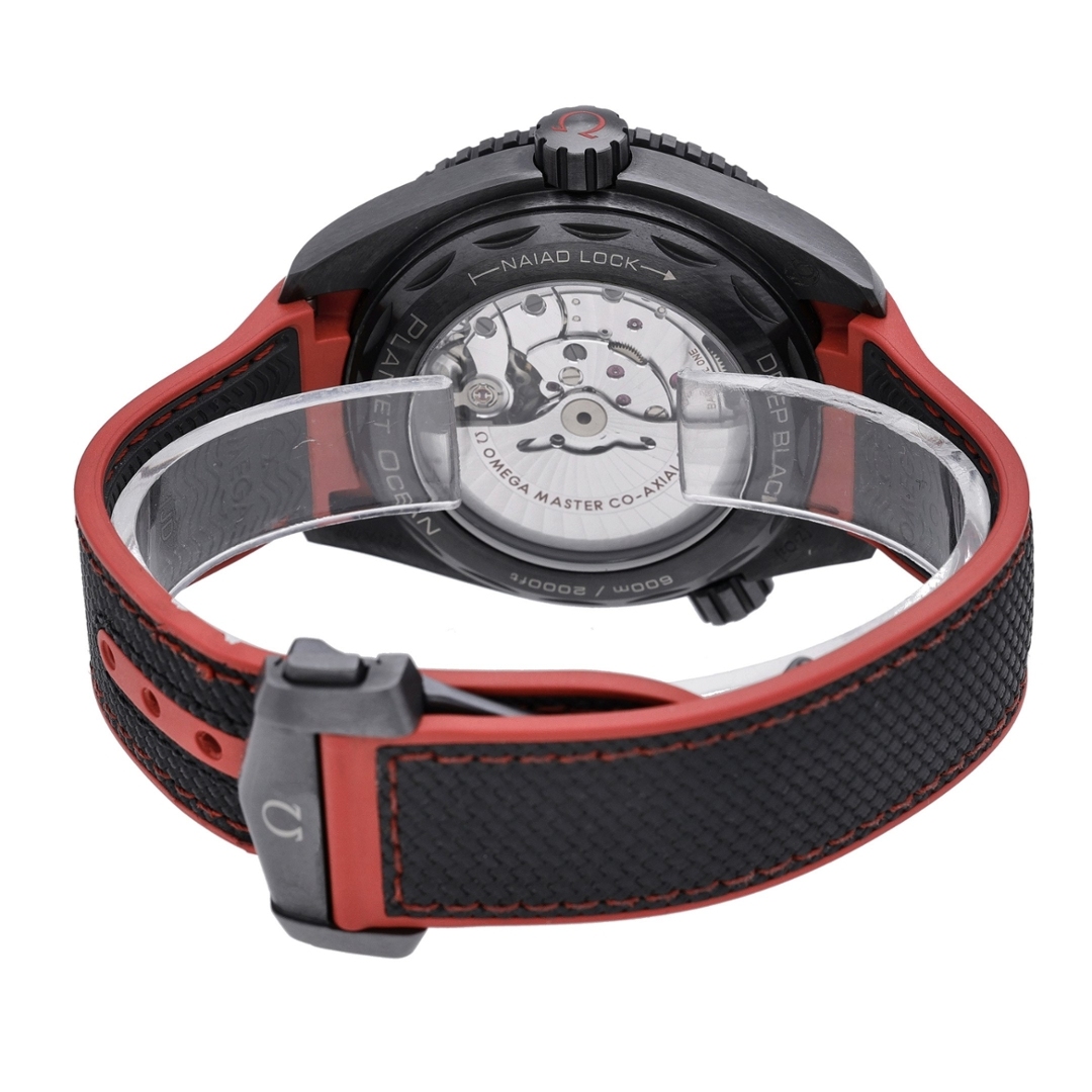 An Omega Seamaster Planet Ocean GMT “Deep Black” Watch, featuring a robust 45.5mm black ceramic case paired with a black rubber strap detailed in red. The matching black ceramic bezel is filled with red Liquidmetal for the first 15-minute scale, adding a bold visual edge. The black dial is accented with red text and a red GMT hand for a striking and legible finish.