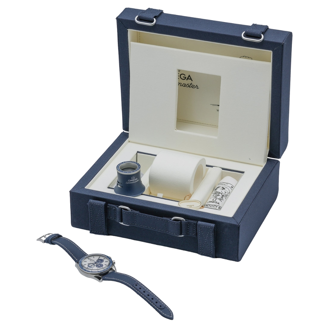 An Omega Speedmaster Anniversary Series (Snoopy) Watch, Blue Leather Strap with a Stainless Steel Case & Clasp and a Blue Bezel on a White Dial