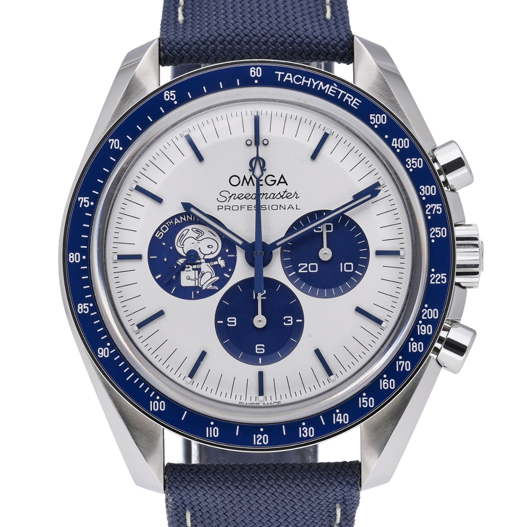 An Omega Speedmaster Snoopy Watch, Stainless Steel with a Blue Bezel on a White Dial