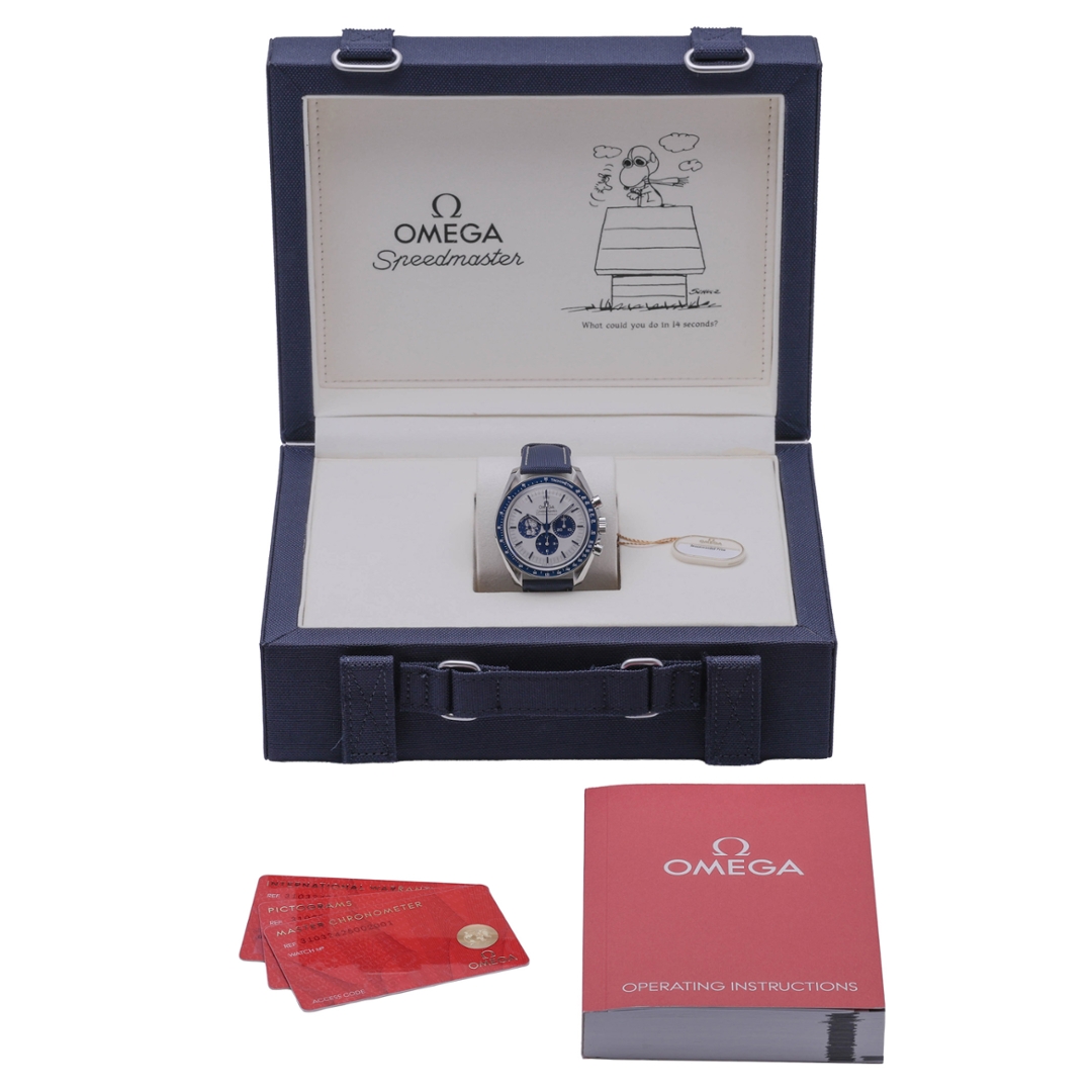 An Omega Speedmaster “Silver Snoopy Award” 50th Anniversary, reference 310.32.42.50.02.001, presented in stainless steel with its striking blue ceramic tachymetre bezel and crisp white dial. This 42mm 2026 example is offered in immaculate condition, showcasing the instantly recognisable blue sub-dials and the iconic Snoopy medallion within the 9 o’clock register. The contrast between the vivid blue accents and the silver-white dial gives this Speedmaster a distinctive, highly collectable character within the Moonwatch lineage.