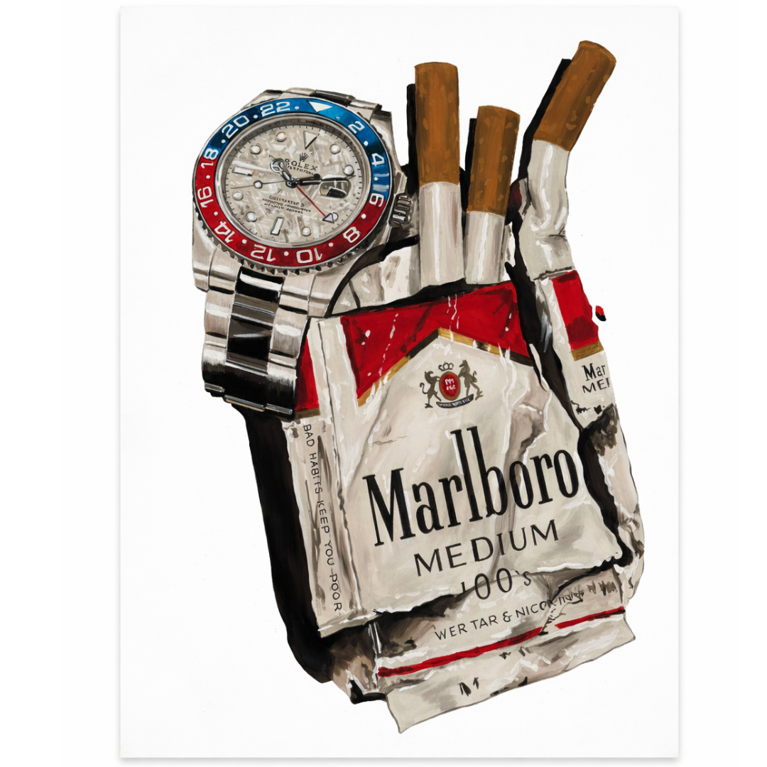 A bold and contemporary original oil painting by Liam Jacobi, featuring a striking Rolex GMT-Master II set against a vividly rendered pack of Marlboro cigarettes. The composition merges luxury horology with raw, everyday iconography, creating a powerful visual contrast that immediately commands attention. The watch is executed with sharp precision, showcasing its distinctive red and blue bezel, detailed dial, and steel bracelet against the worn textures of the packaging.
