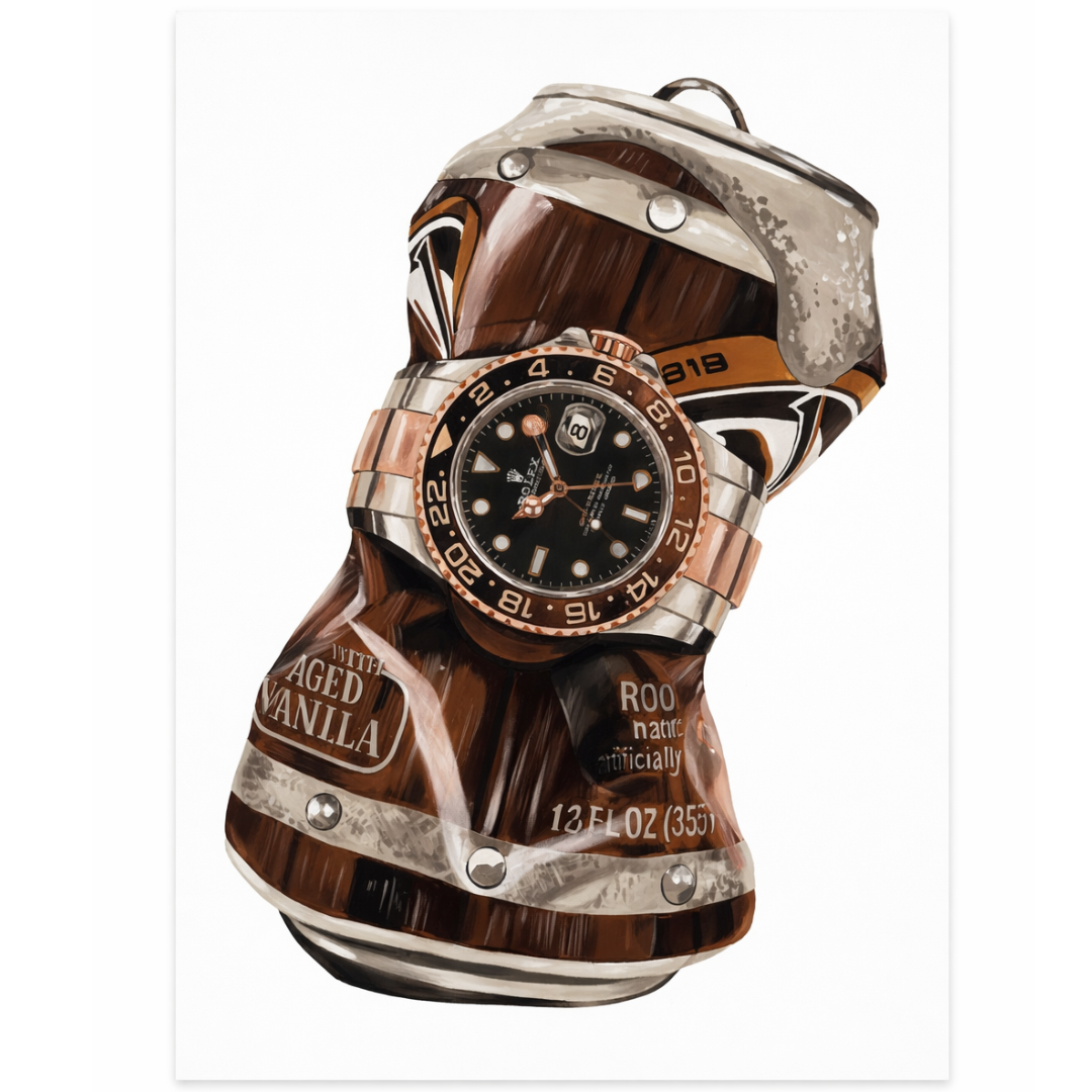 A striking original oil painting by Liam Jacobi, presenting a bold fusion of luxury horology and contemporary lifestyle imagery. The composition centres on a Rolex GMT watch, rendered with impressive precision, wrapped around a crushed root beer can. The rich tones and reflective detailing capture both the weight of the timepiece and the textured realism of the aluminium can, creating an immediate visual impact.