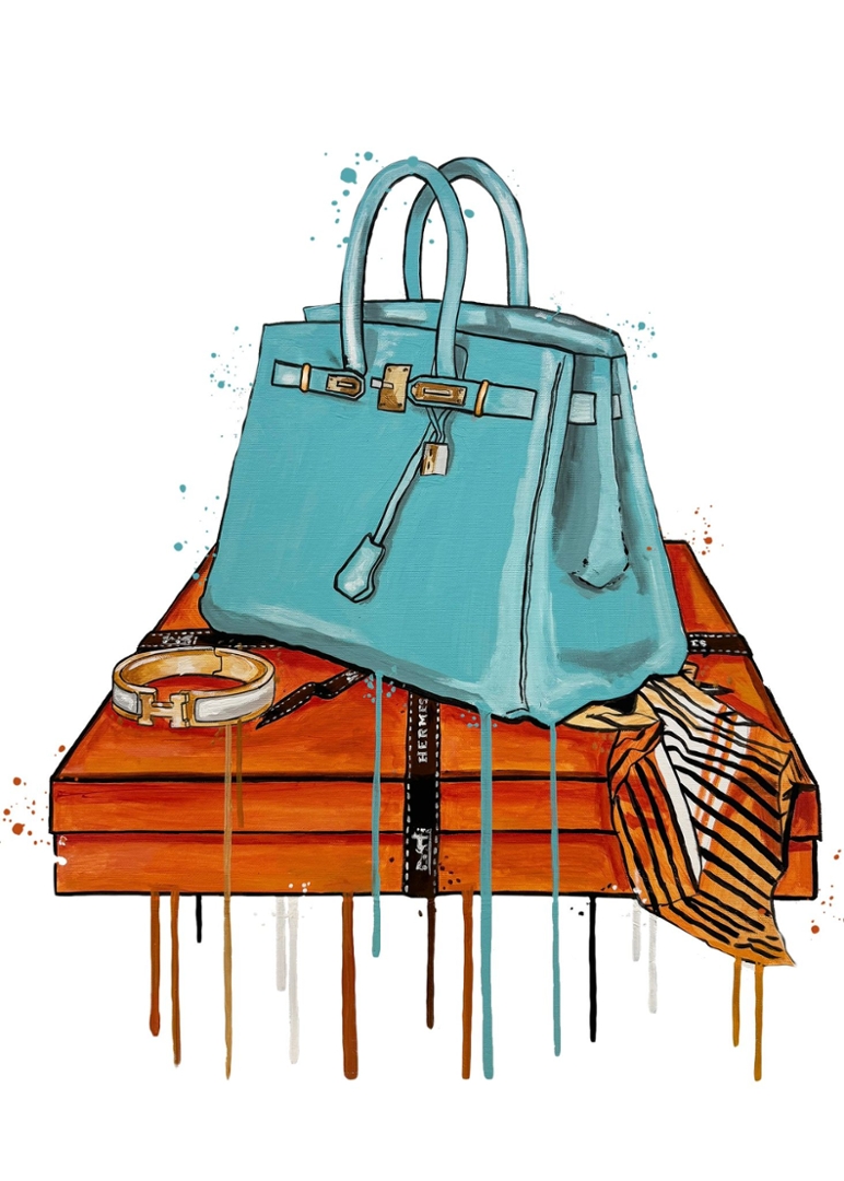 An original painting by the artist Liam Jacobi of a Hermes Birkin Handbag.
