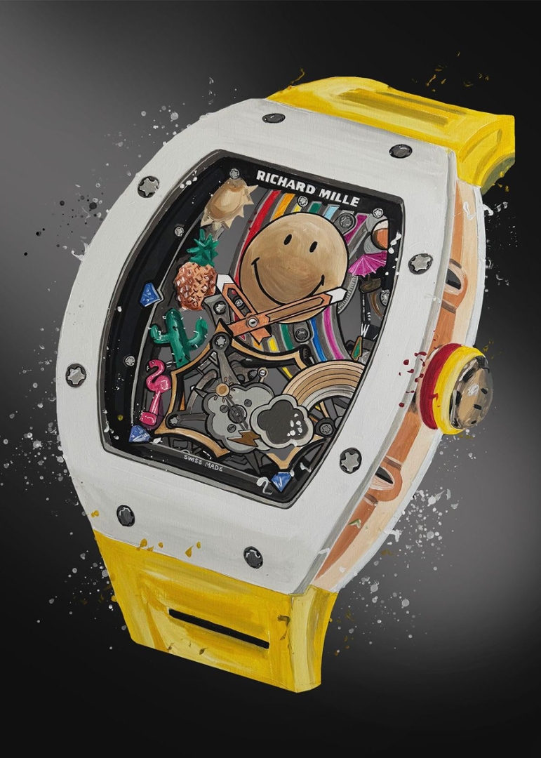 A bold and expressive original oil painting by Liam Jacobi, inspired by the iconic Richard Mille RM 88 Smiley watch. This piece captures the playful complexity of the timepiece, with its vibrant, multi-layered dial brought to life through energetic brushwork and vivid colour contrasts. The central smiley motif adds a distinctive character, while the dynamic composition reflects the avant-garde spirit synonymous with Richard Mille’s innovative design language.