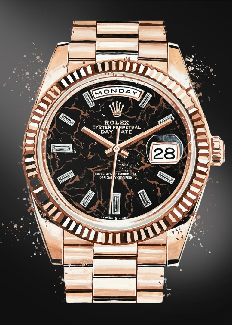 An original painting by the artist Liam Jacobi of a Rolex Eisenkiesel Day-Date Watch.