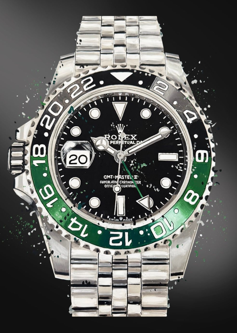 A bold and contemporary original oil painting by Liam Jacobi, showcasing the distinctive Rolex GMT “Sprite” with its striking black and green bezel. The composition captures the recognisable aesthetic of this modern classic, with crisp detailing across the dial and bracelet, brought to life through expressive brushwork and subtle splashes that add energy and depth. The rich green background enhances the colour palette, creating a visually impactful and instantly recognisable piece.