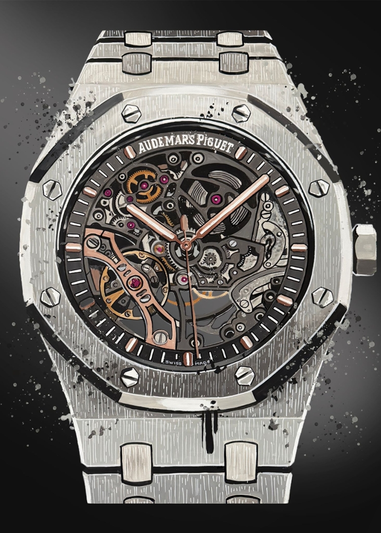 An original painting by the artist Liam Jacobi of an Audemars Piguet Steel Skeleton Watch.