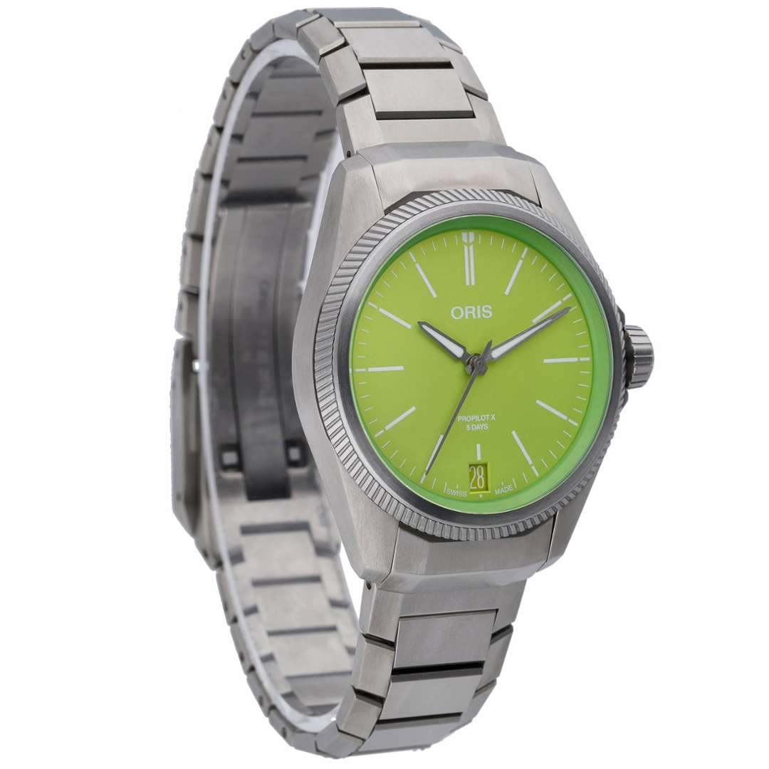 An Oris ProPilot X Kermit Edition reference 01 400 7778 7157 is presented in lightweight titanium, featuring a 39mm case paired with a matching titanium bracelet and the brand’s distinctive lift-style clasp. The watch is defined by its lime-green dial, accented with crisp applied indices and hands, and the playful Kermit date aperture at 6 o’clock, adding a subtle yet recognisable signature to the design. The fluted titanium bezel reinforces the ProPilot’s aviation-inspired aesthetic.