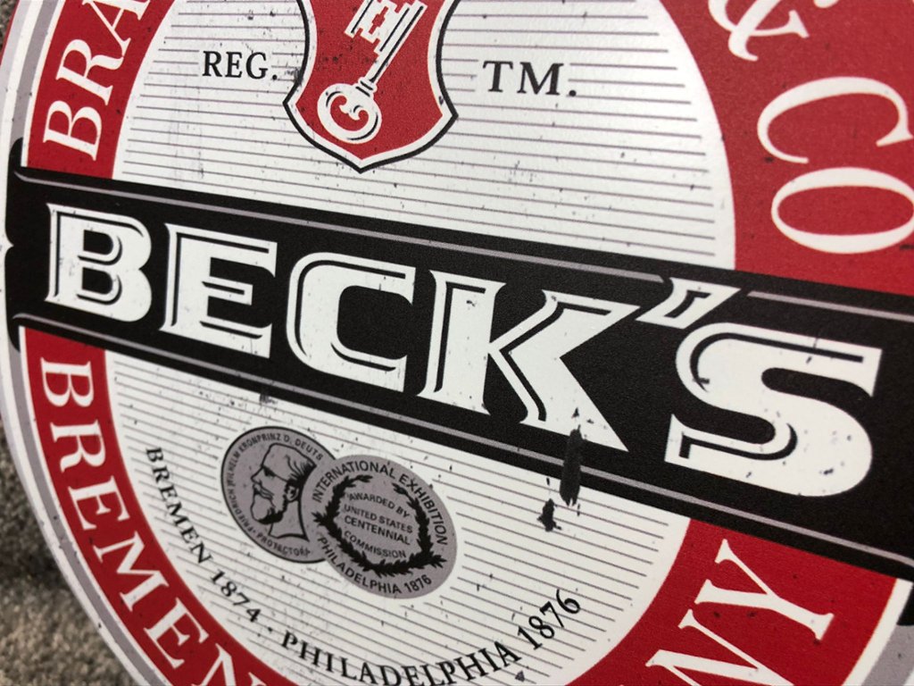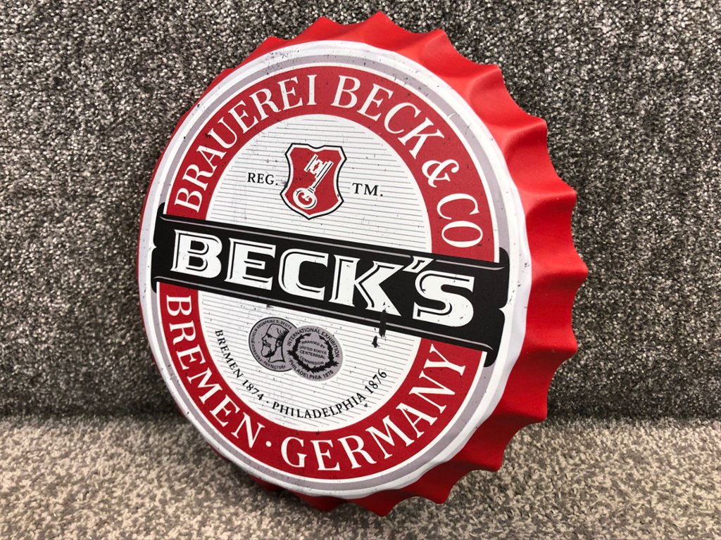 Constructed from sturdy aluminium, this wall hanging features the signature Beck logo prominently displayed on the bottle top, intricately engraved and embossed to replicate the original design. Whether showcased in a home bar, man cave, or entertainment area, it adds an authentic touch of brewery heritage and beer culture to any space.