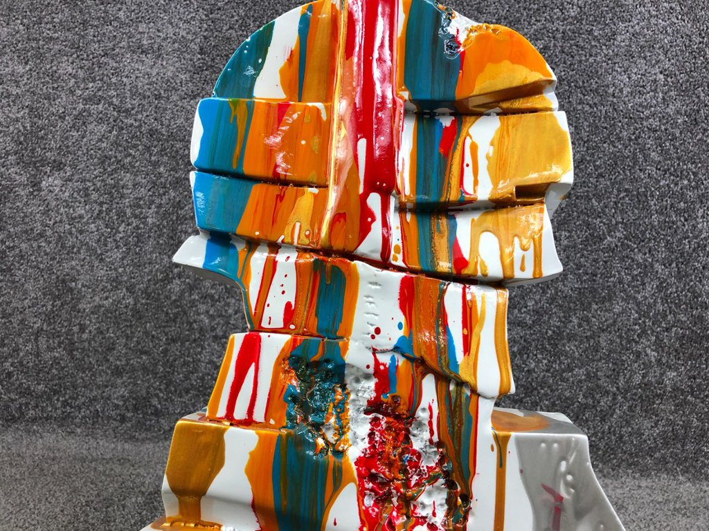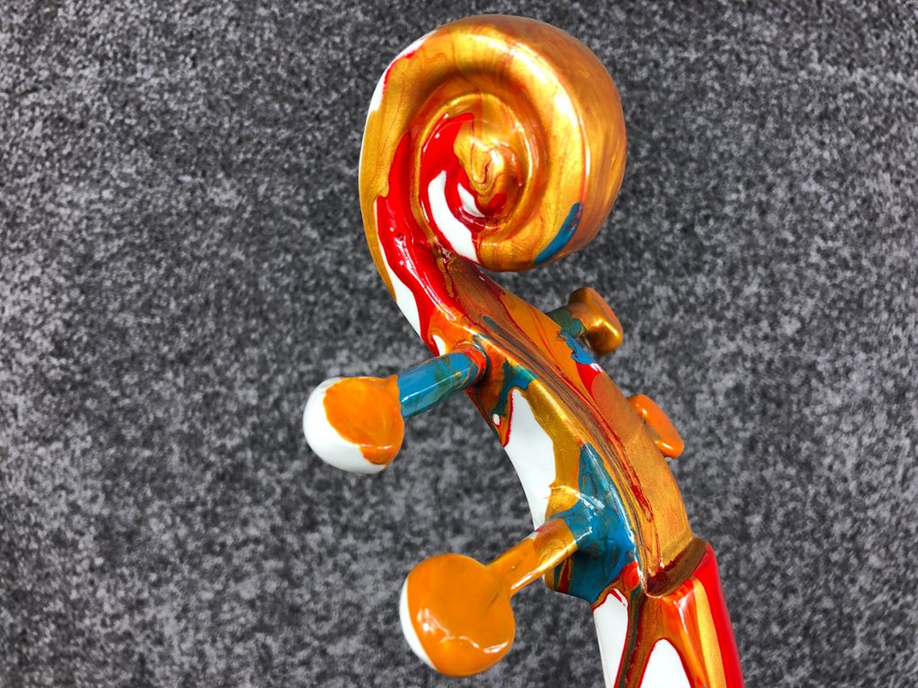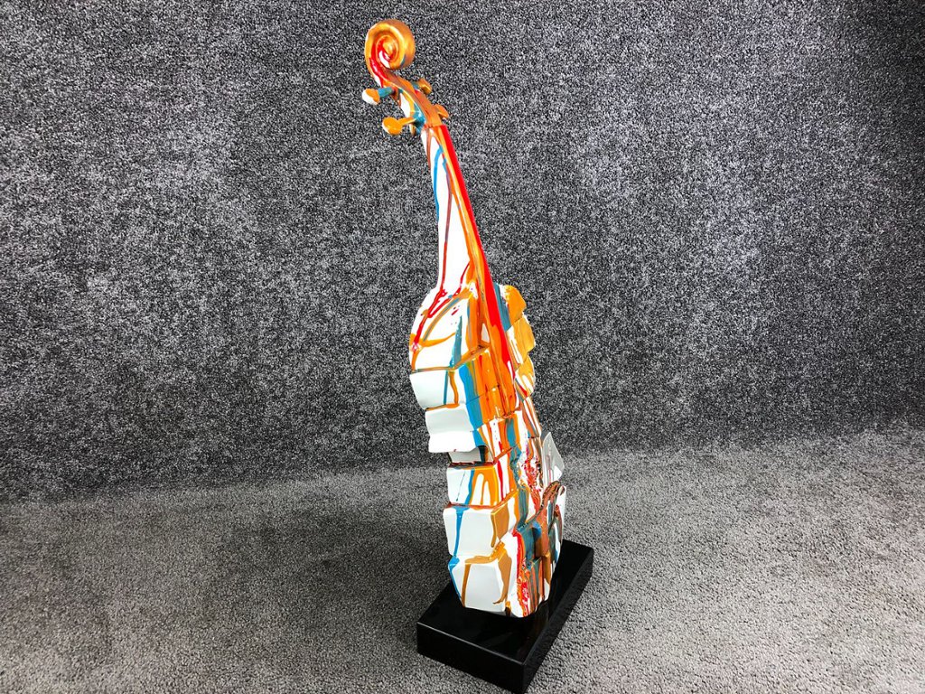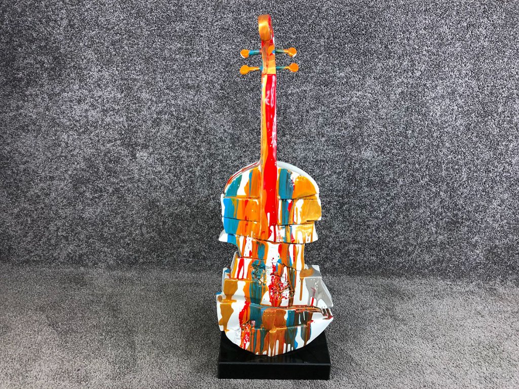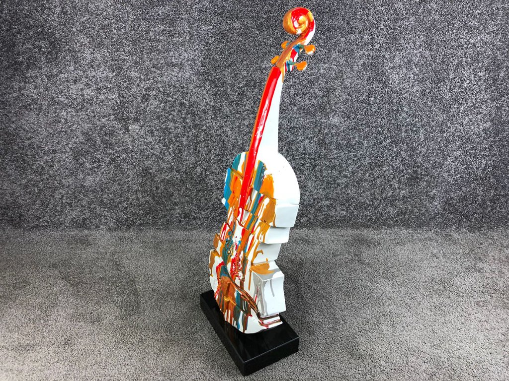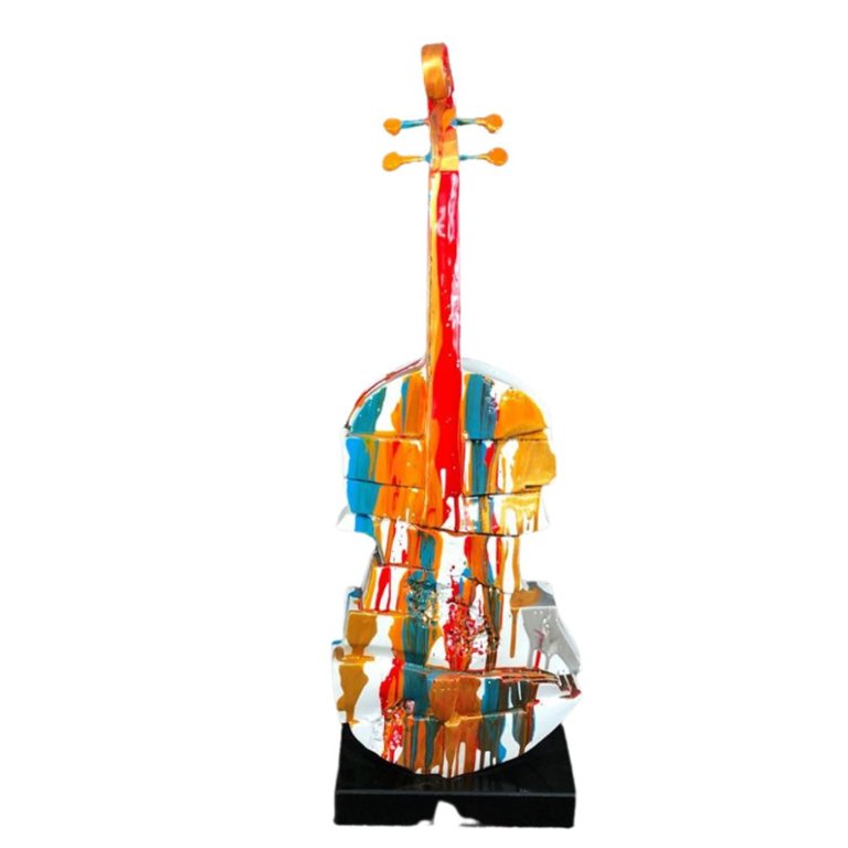 Crafted with meticulous attention to detail, the sculpture features a stylized representation of a violin adorned with colourful paint splashes, evoking the passion and creativity of musical expression. The sleek black marble base adds a touch of sophistication and contrast, highlighting the sculpture's bold and dynamic design.