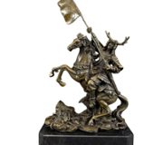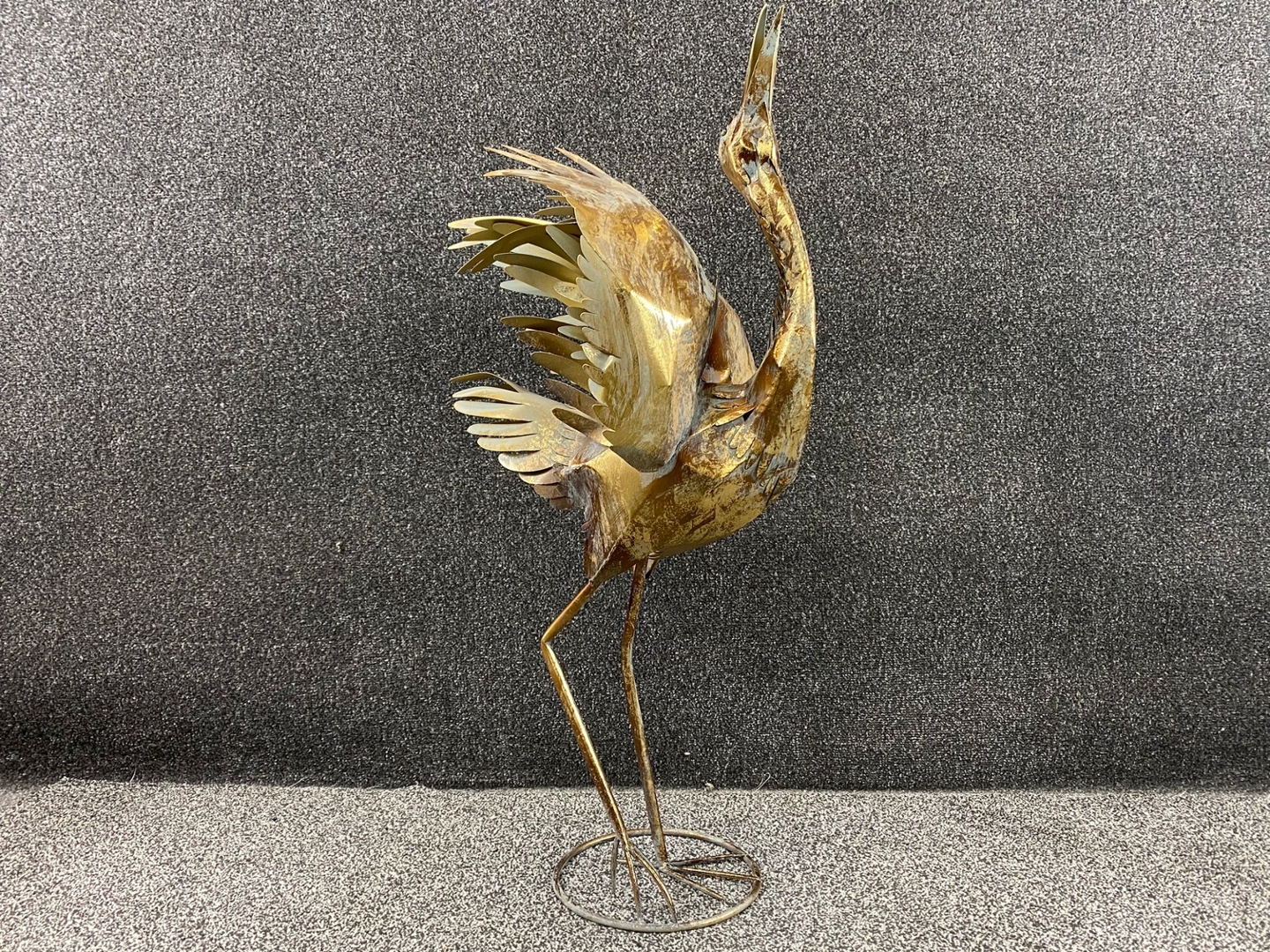 A pair of gold cranes brings elegance and grace to any setting, with their statuesque design and impressive dimensions of approximately 37 inches in height, 25 inches in width, and 15 inches in depth. The two cranes, crafted with an intricate metallic finish, stand poised as if mid-motion. One crane raises its head and spreads its wings, exuding a sense of freedom and movement, while the other stands serenely, gazing forward with quiet dignity.