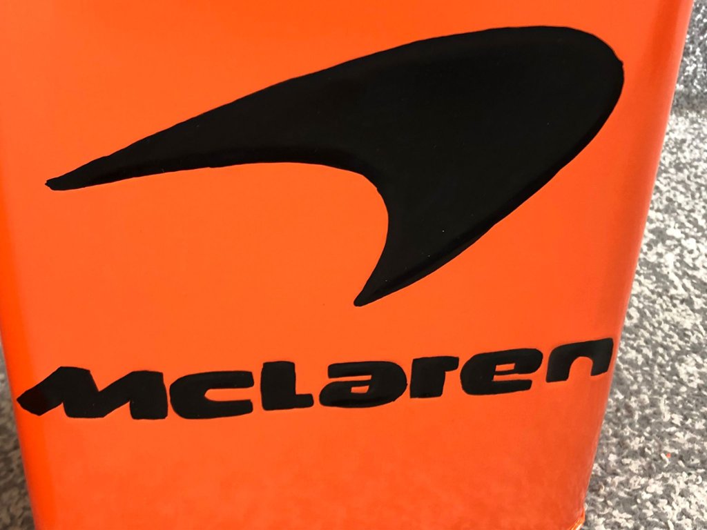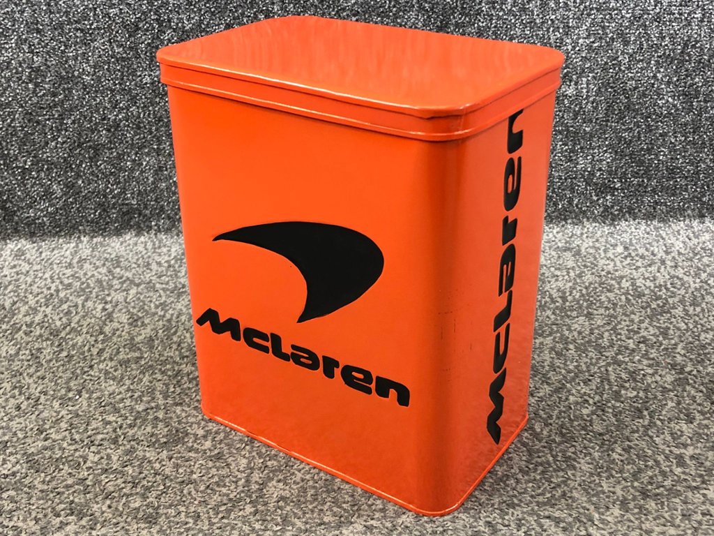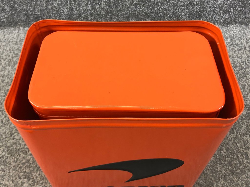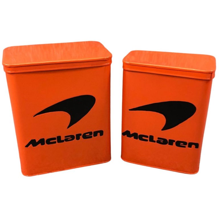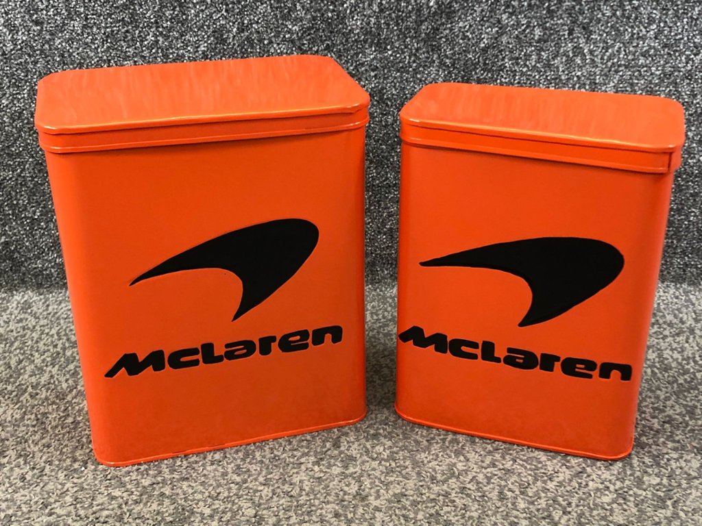 A pair of orange & black McLaren storage tins. Approx 12" height, 10" width, 6" depth.