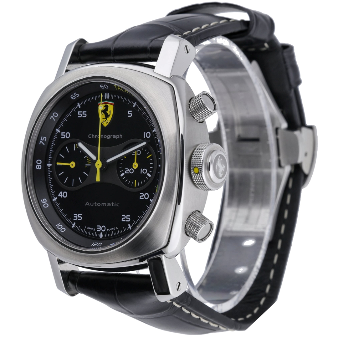 This Panerai Ferrari chronograph reference FE00008 features a bold 45mm stainless steel case, paired with a black leather strap and matching stainless steel clasp. The black dial is framed by a tachymeter bezel and displays the Ferrari shield at twelve o’clock, with contrasting sub-dials and yellow chronograph accents providing strong legibility. Large pushers and a prominent crown reinforce the watch’s motorsport-inspired design language.