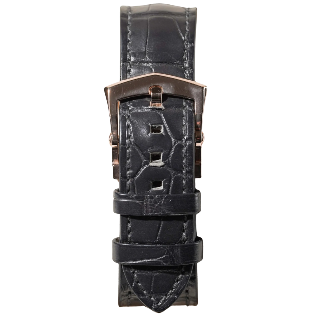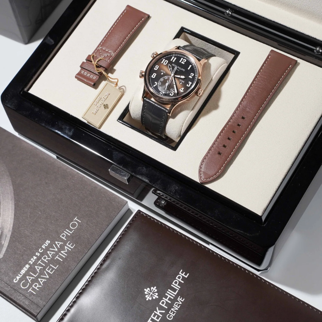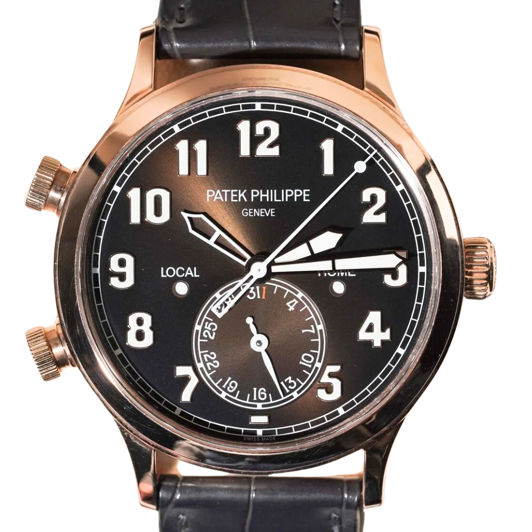 A Patek Philippe Calatrava Pilot Travel Time reference 5524R-001 in 18ct rose gold, presented on a black leather strap with a matching rose gold clasp, embodies a distinctive blend of aviation-inspired design and traditional Genevan craftsmanship. The rich brown dial, complemented by bold Arabic numerals and luminous hands, ensures excellent legibility while maintaining a refined yet contemporary aesthetic unique to this model.