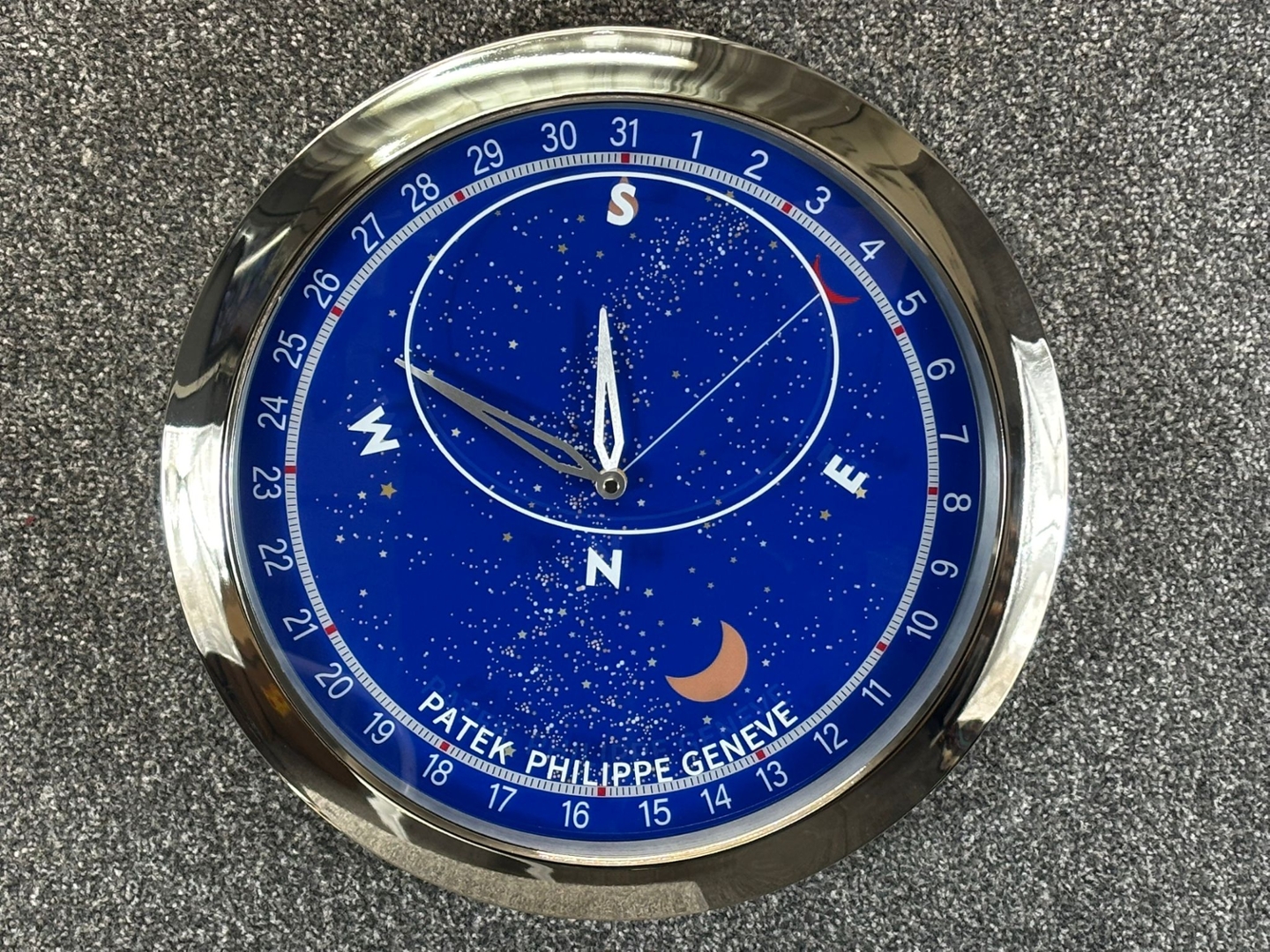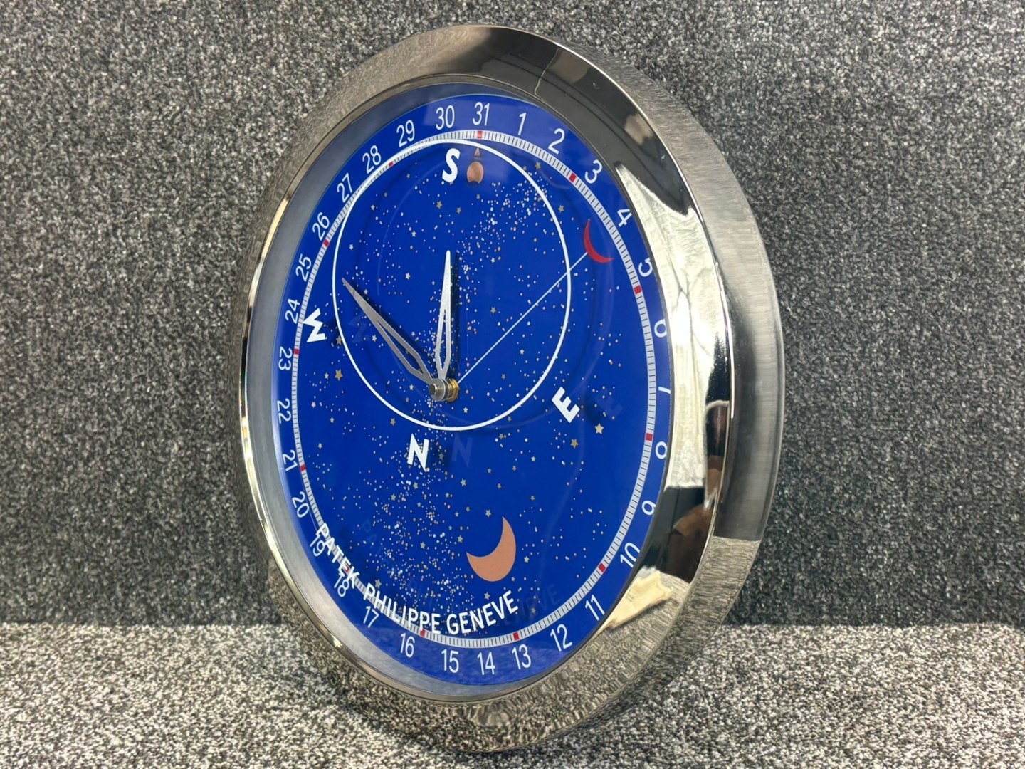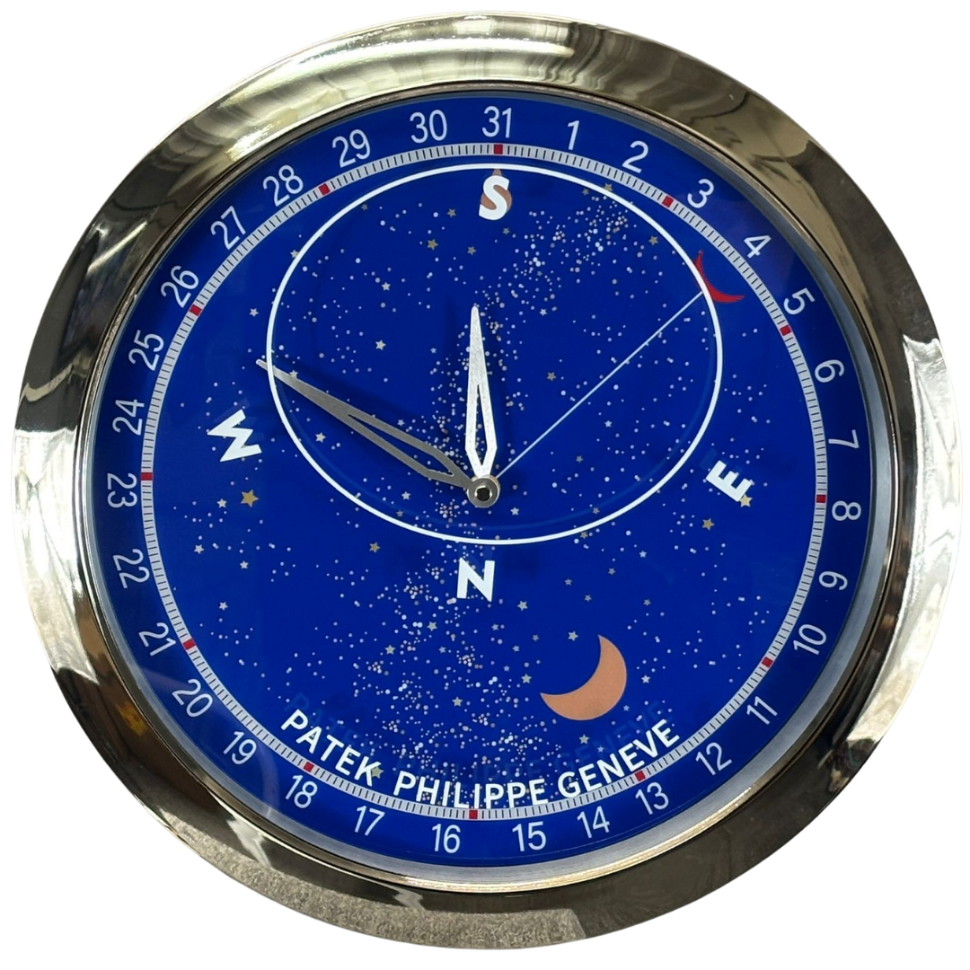 A stainless steel replica Patek Philippe Grand Complications Celestial Moon Age Platinum Blue Wall Clock with a sweeping second hand. Approx 14" height, 14" width.