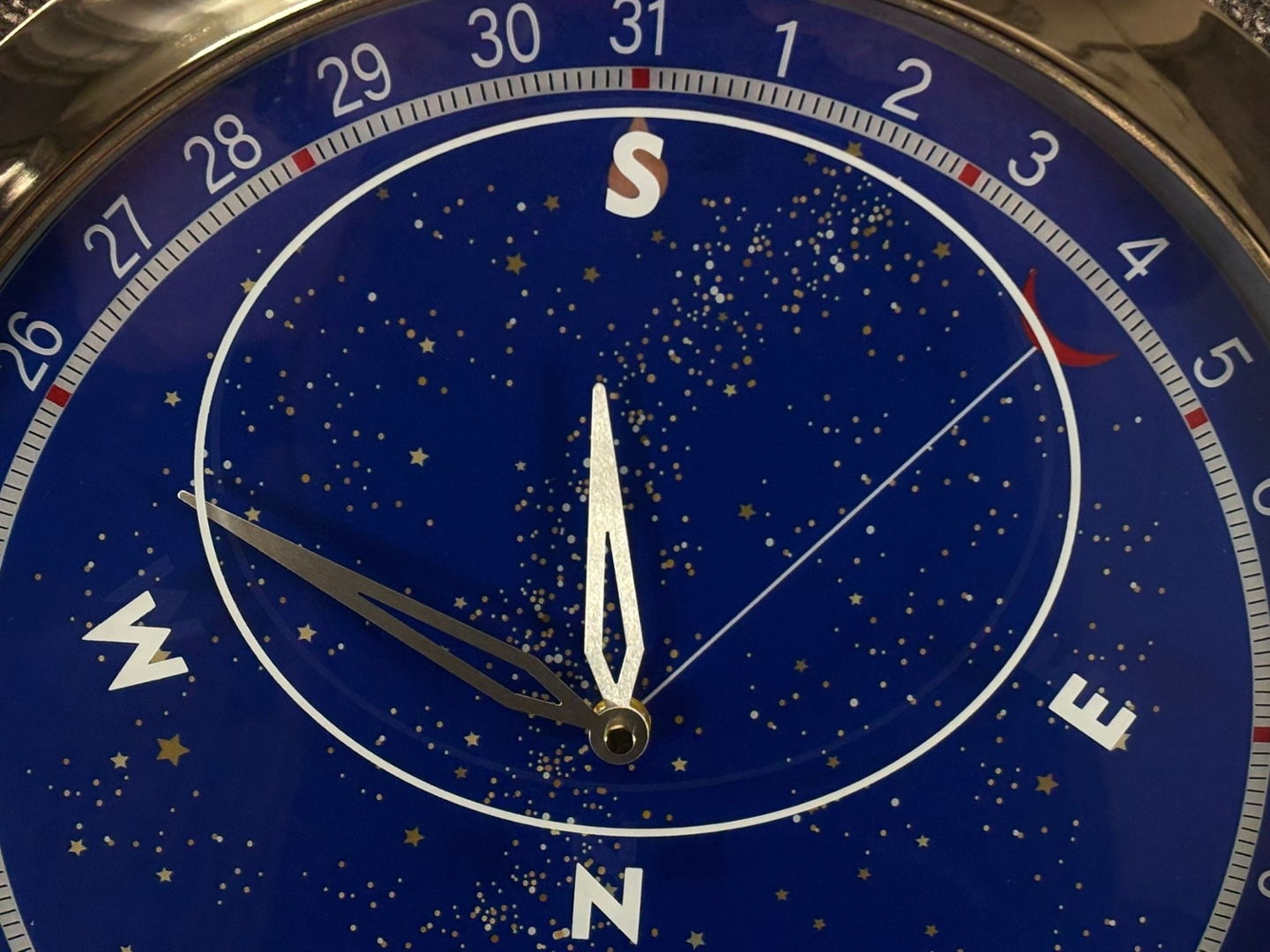 A stainless steel replica of the Patek Philippe Grand Complications Celestial Moon Age Wall Clock. Inspired by one of the most iconic masterpieces in haute horology, this exquisite wall clock captures the magic of the night sky with a captivating star chart, moon phase display, and cardinal directions. Encased in a lustrous stainless steel finish, it features a sweeping second hand for smooth, silent timekeeping. Measuring approximately 14 inches in both height and width, this commanding piece makes a bold statement in any luxury interior. The rich midnight-blue dial is adorned with golden stars, a crescent moon, and elegant silver-tone hands, creating a mesmerising visual reminiscent of the original platinum Patek Philippe design. Whether displayed in an office, study, or boutique setting, this clock is sure to turn heads and ignite conversation. A perfect blend of astronomical beauty and horological tribute, ideal for collectors and design enthusiasts alike.