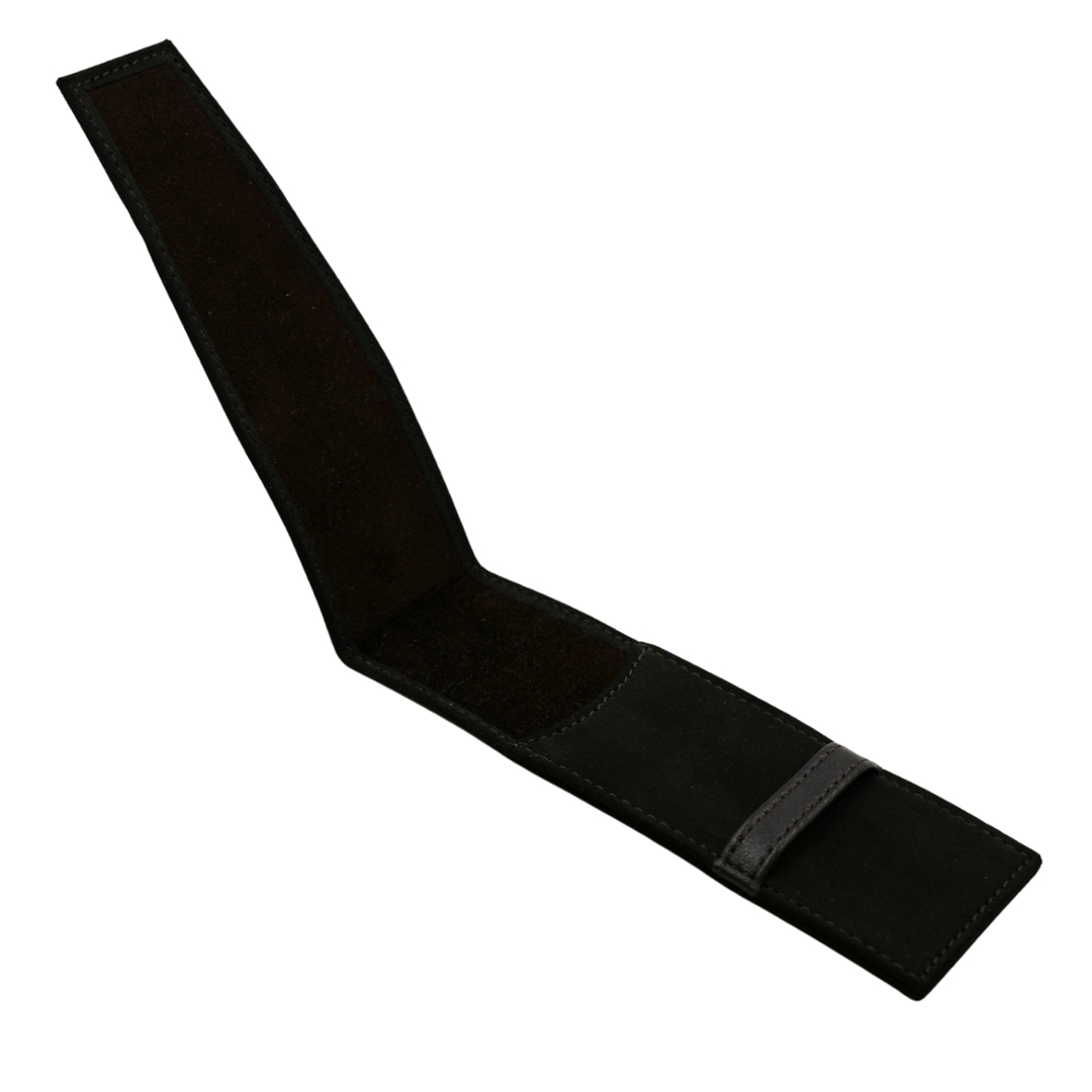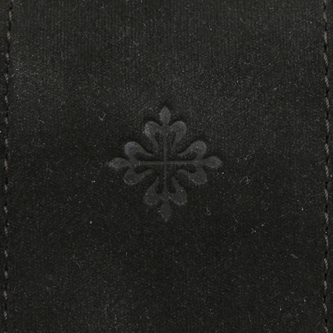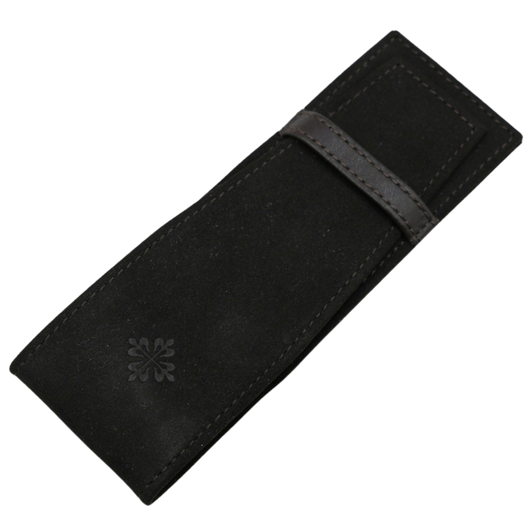 A refined Patek Philippe strap case crafted in soft black suede, designed to store and protect spare watch straps with understated elegance. The exterior presents a slim, elongated profile with subtle edge stitching and a discreetly applied Calatrava cross, reflecting the maison’s minimalist approach to branded accessories. The suede finish gives the piece a tactile, luxurious feel while remaining visually restrained.