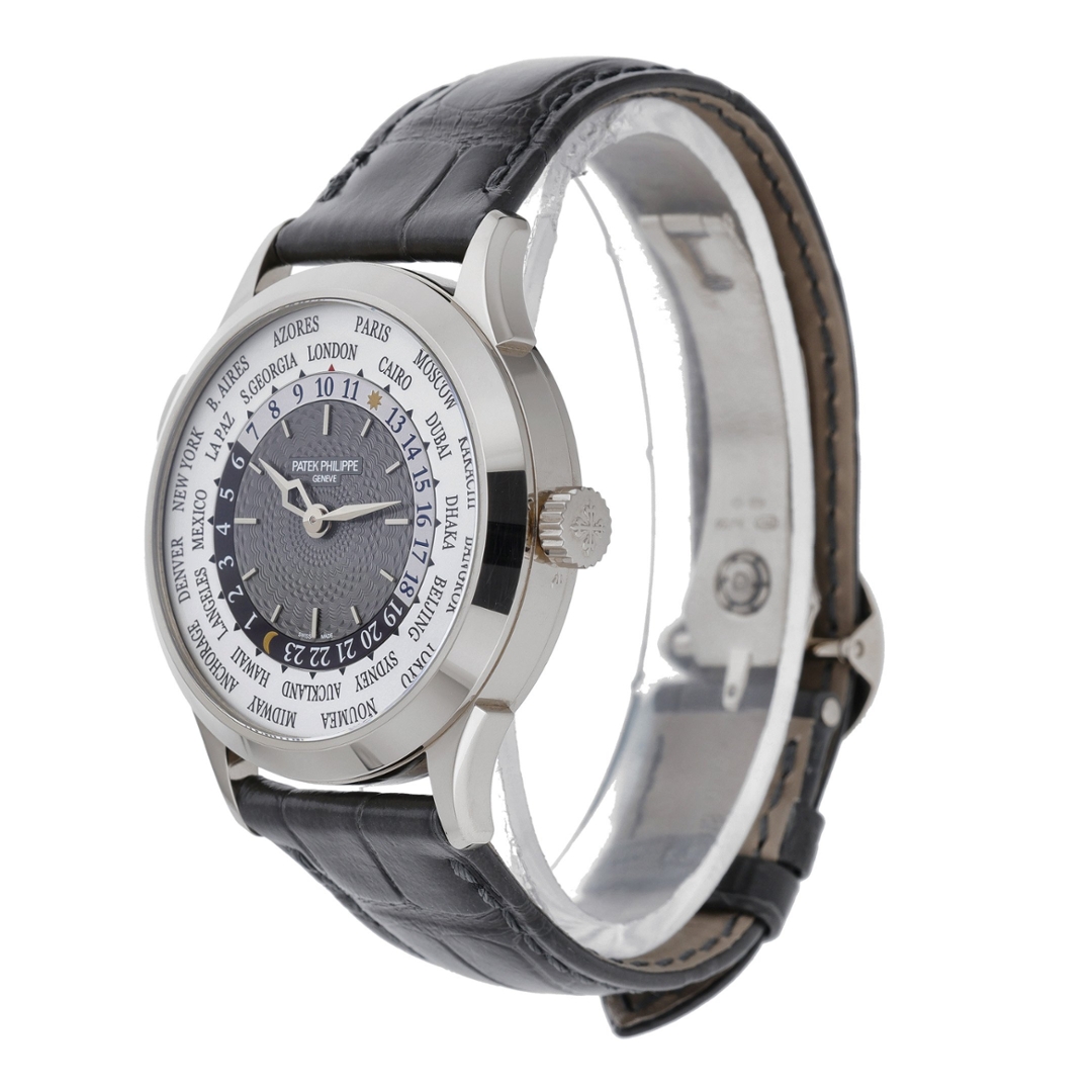 A Patek Philippe World Time watch, presented on a luxurious black leather strap, features an 18ct white gold case and matching clasp, showcasing a beautifully detailed white dial. Model number 5230G-014, this 2022 example embodies Patek Philippe’s mastery of world time complications, powered by the self-winding Calibre 240 HU movement. This sophisticated mechanism allows the wearer to view 24 time zones simultaneously, with effortless adjustment via the signature pusher at 10 o’clock—an ingenious design that has become a hallmark of the World Time lineage.