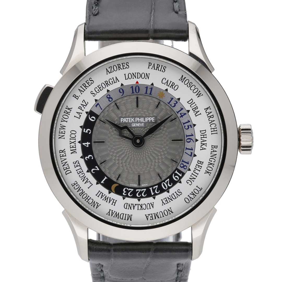 The 38.5mm white gold case strikes an elegant balance between tradition and wearability, complemented by Patek’s distinctive winglet-style lugs and fine craftsmanship throughout. The white dial features an intricately guilloché centre, framed by a rotating city ring and 24-hour day/night indicator, achieving both visual beauty and technical brilliance.