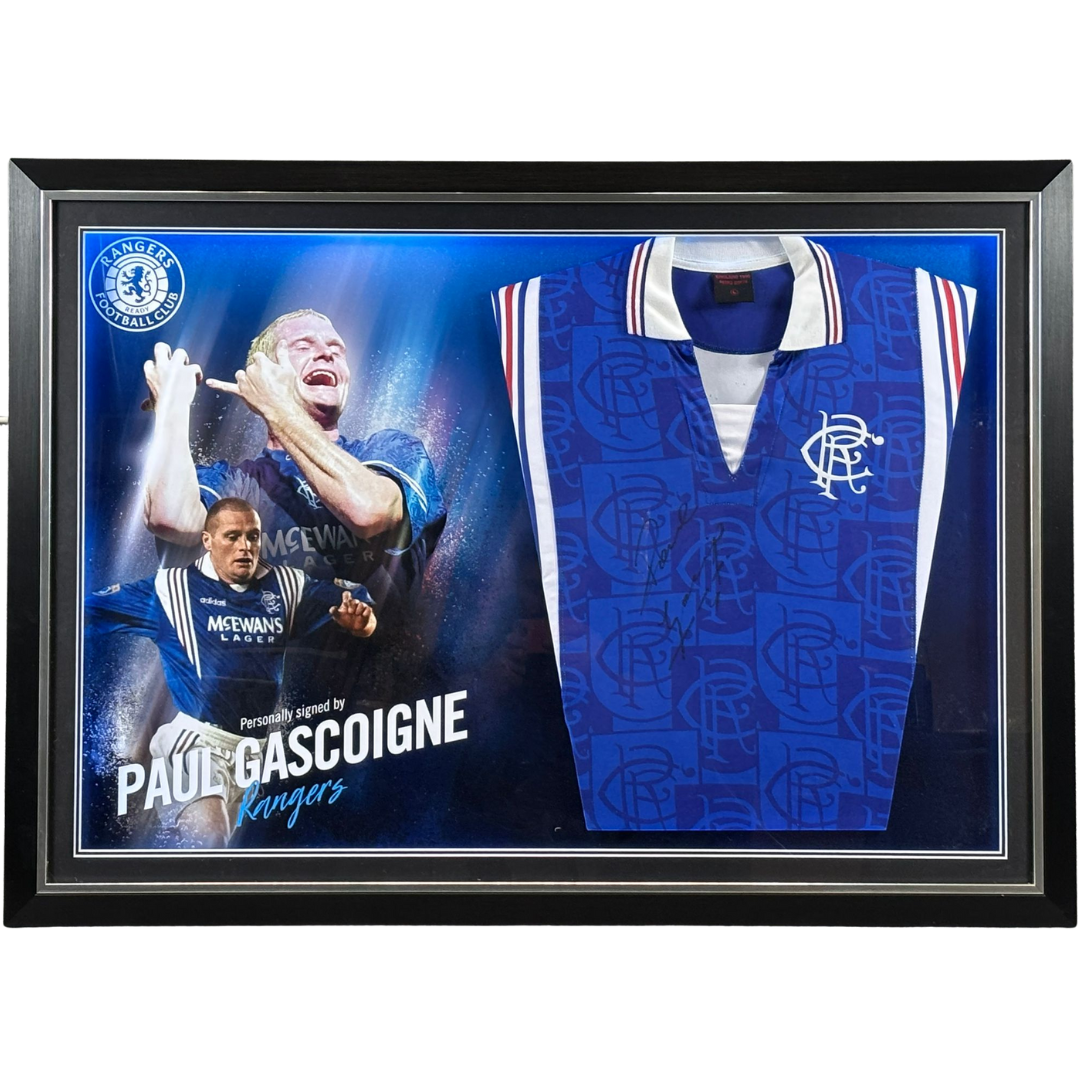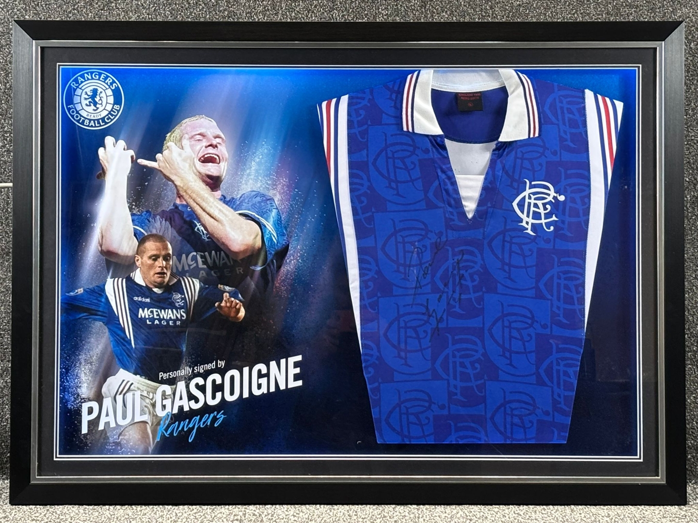 A signed and authenticated Paul Gascoigne Rangers Shirt in a presentation frame. Approx 77cm height, 109cm width.