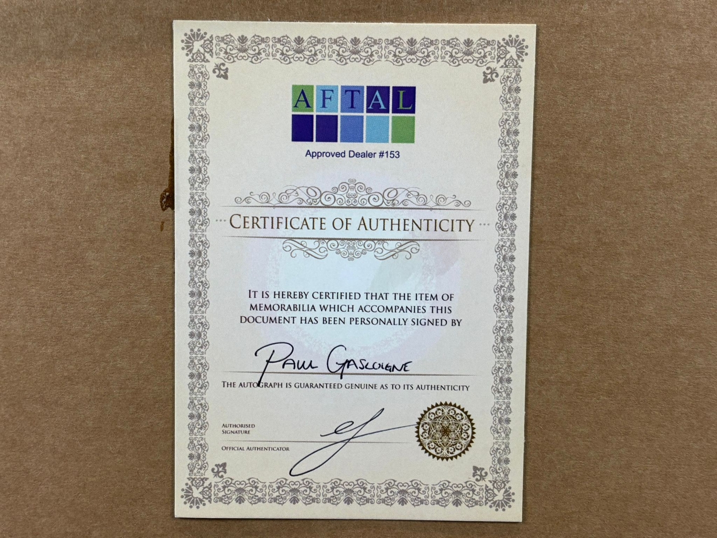 A signed and authenticated Paul Gascoigne Rangers shirt, beautifully presented in a premium display frame. Featuring Gazza’s legendary number 8 shirt with his signature elegantly placed on the number, this piece captures the spirit of a player whose genius lit up Ibrox during a thrilling era for the club. The background showcases action shots of Gascoigne in his prime, clad in Rangers blue and playing with the heart and flair that made him a fan favourite around the globe.