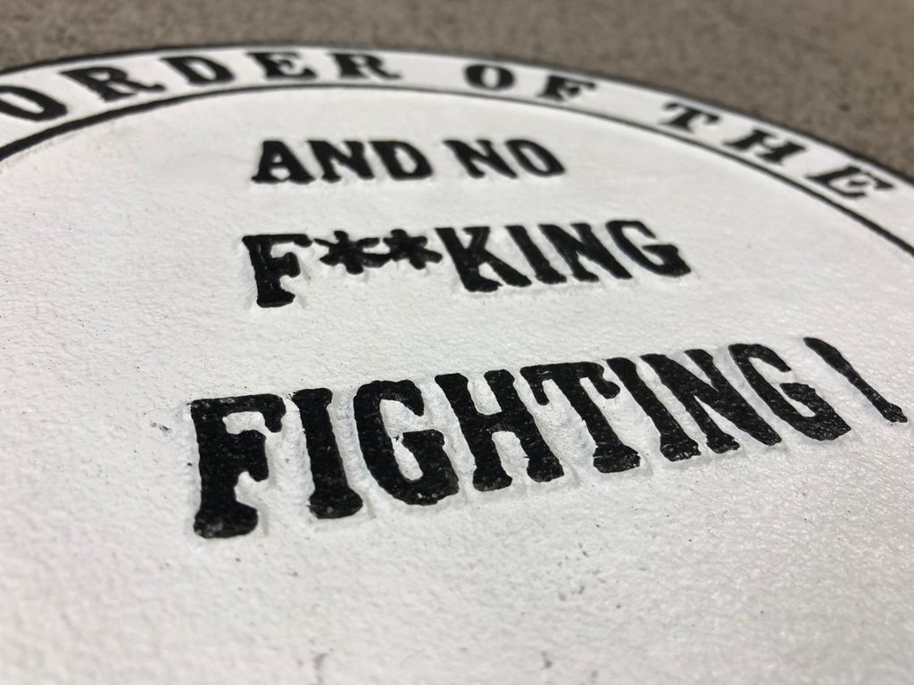 A white and black wrought iron Peaky Blinders style wall plaque titled 'No Fighting'. Approx 10" diameter.