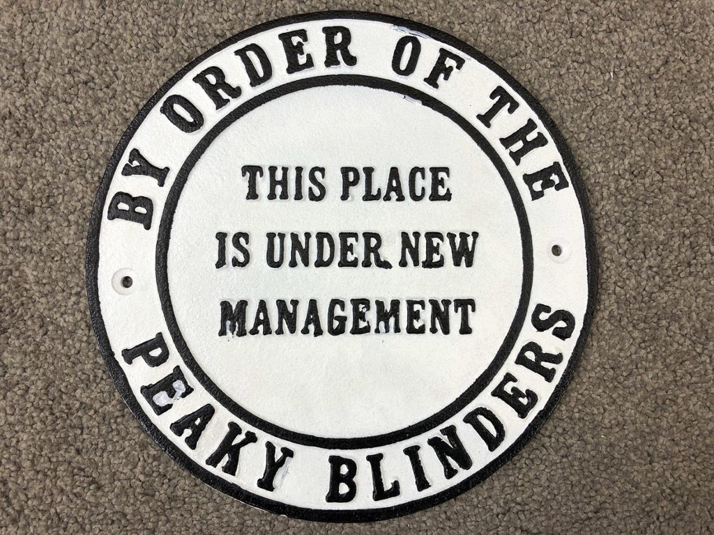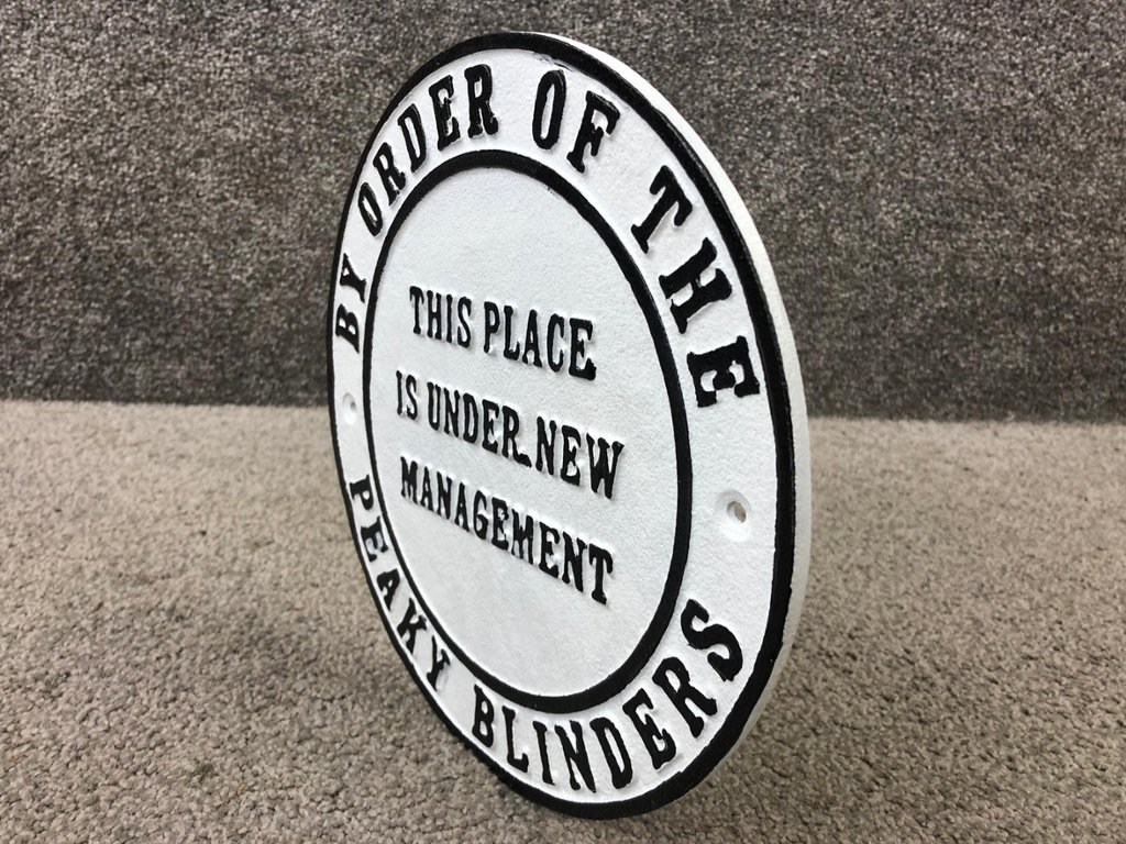 Crafted from durable wrought iron, the plaque features bold lettering and intricate detailing that captures the essence of the Peaky Blinders aesthetic. Its monochromatic colour scheme of white and black exudes sophistication and authenticity, making it a standout piece of decor for fans of the show.