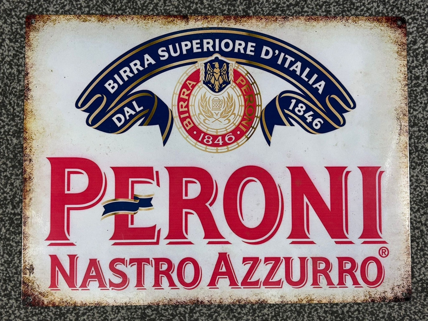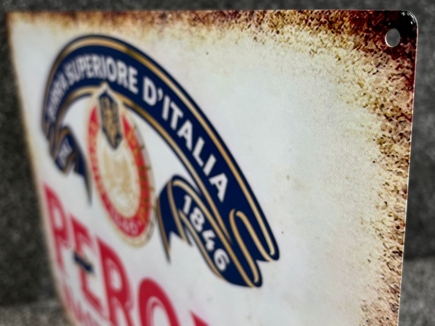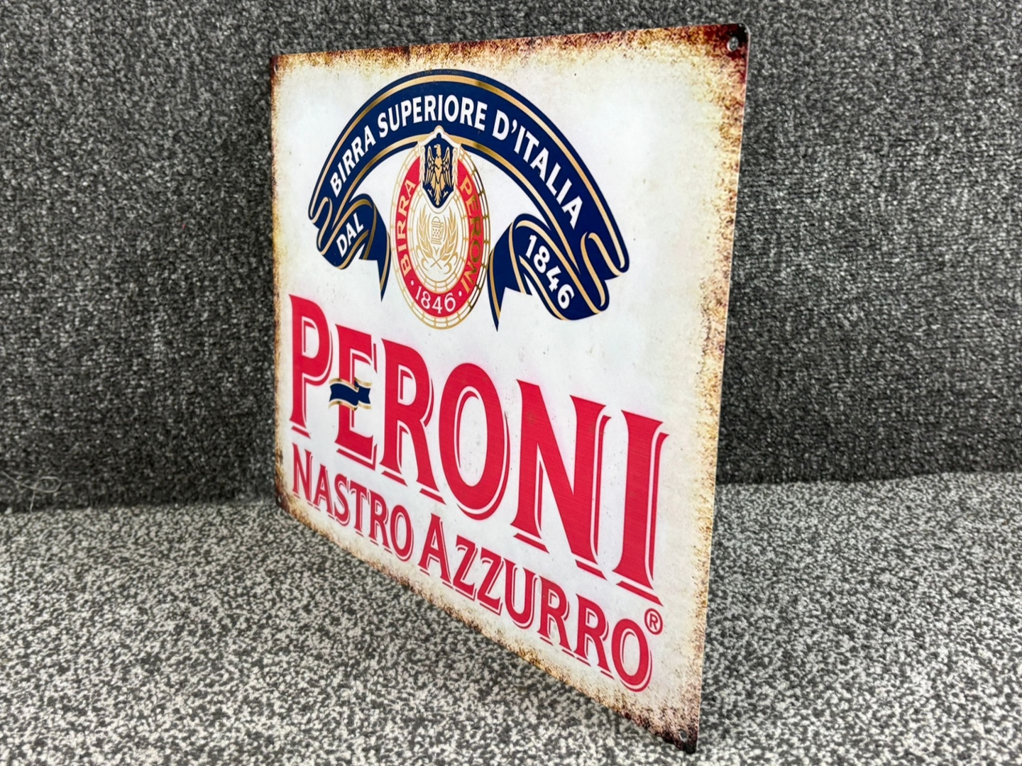 An aluminium Peroni wall mountable sign. Approx 30cm height, 40cm width.