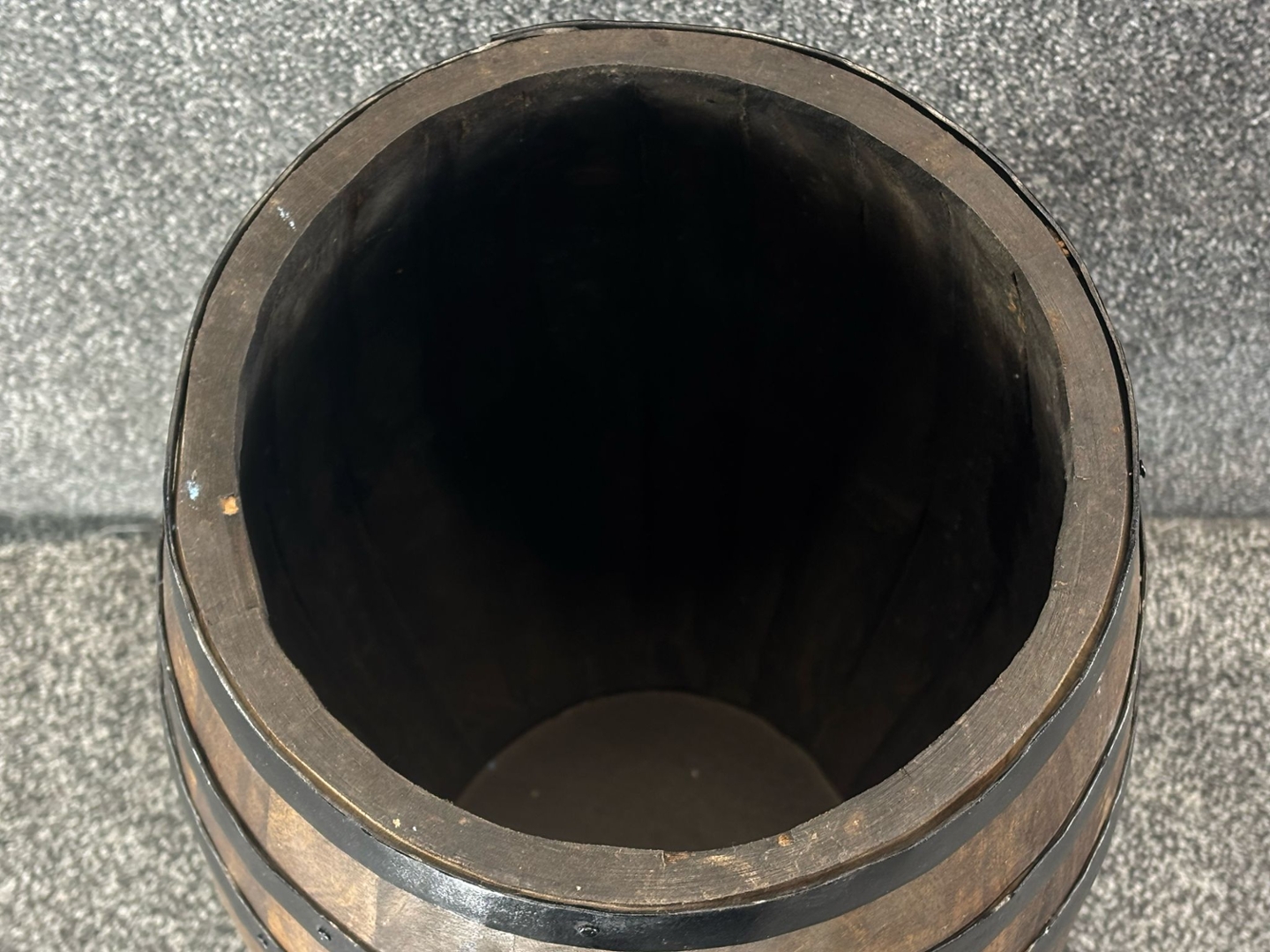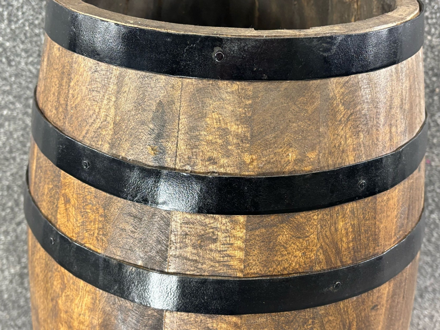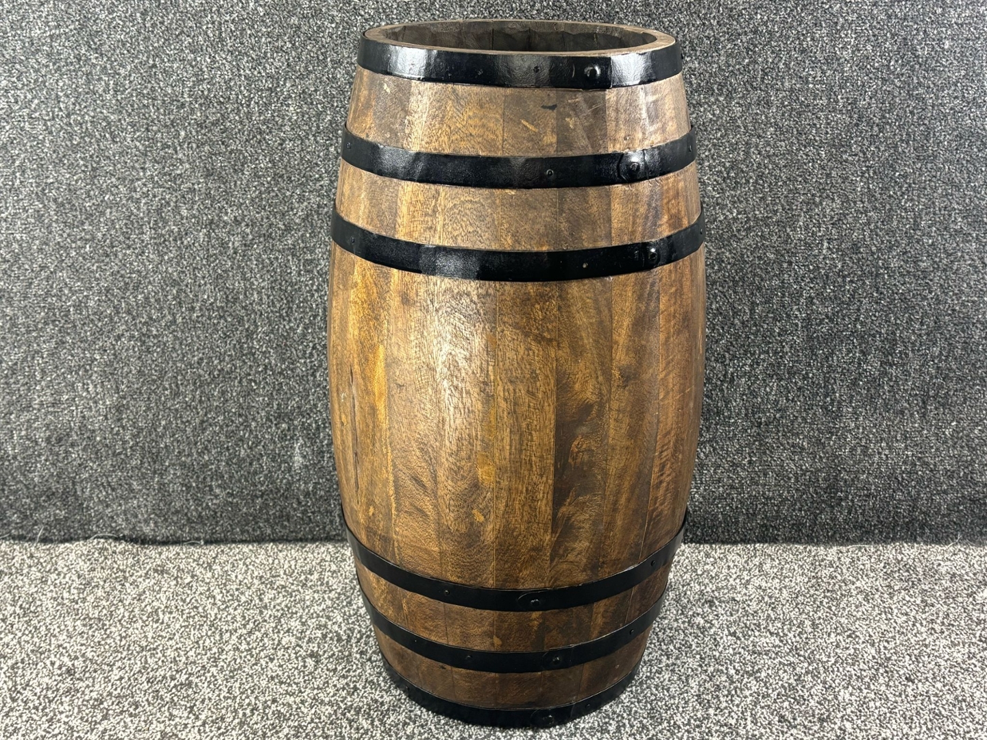 A wooden barrel-style umbrella stand inspired by the luxurious heritage of Perrier-Jouët Champagne. Measuring approximately 60cm in height and 34cm in width, this beautifully crafted piece blends vintage charm with practical functionality. The warm wood tones, complemented by black metal bands, create a rustic yet sophisticated aesthetic, perfect for adding character to any entryway, hallway, or office space.