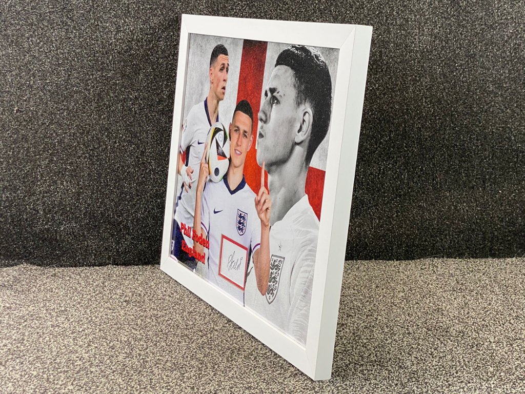 Ideal for a sports memorabilia collection, office, or home display, this framed Phil Foden picture is more than just a decorative item. It is a celebration of Foden's contributions to the England team and his ongoing career. This unique piece serves as both a conversation starter and a cherished memento of contemporary football history, capturing the essence of a player who continues to shape the future of the sport.