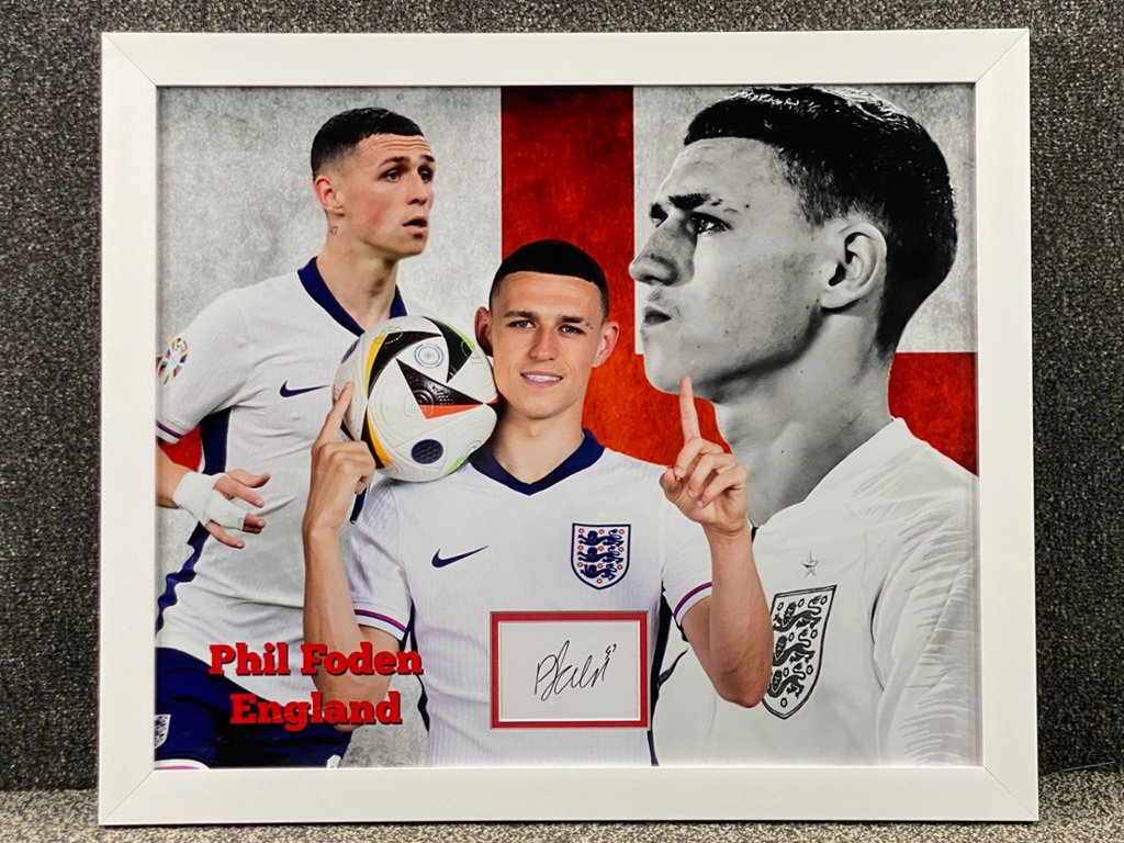 A signed & authenticated Phil Foden England Picture in a presentation frame. Approx 23" height, 27" width.