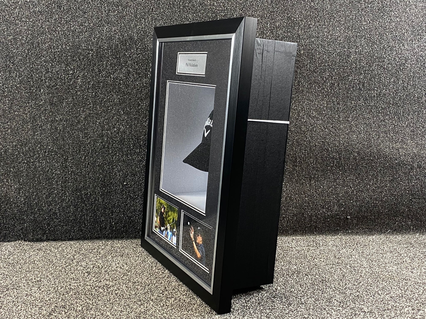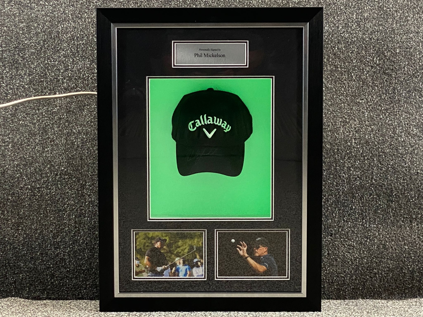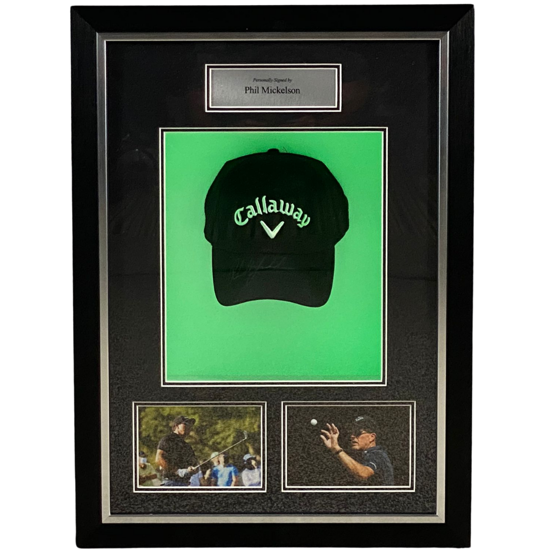 The iconic Callaway cap, signed by Mickelson, is showcased in a beautifully illuminated frame that enhances its visual appeal, making it the perfect centerpiece for any golf enthusiast’s collection. Whether you are a long-time admirer of Mickelson’s legendary career or a dedicated collector of golf memorabilia, this piece offers a unique opportunity to own a tangible connection to one of the sport's most enduring figures. Ideal for any man cave, office, or memorabilia display, this framed cap celebrates the enduring legacy of "Lefty."