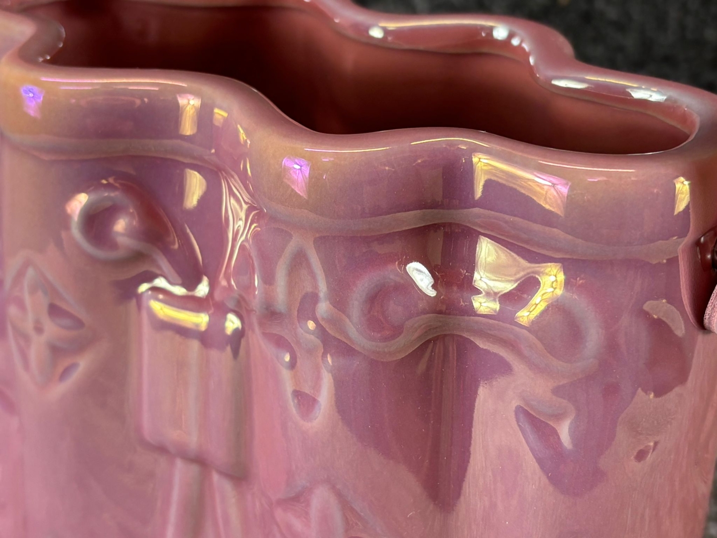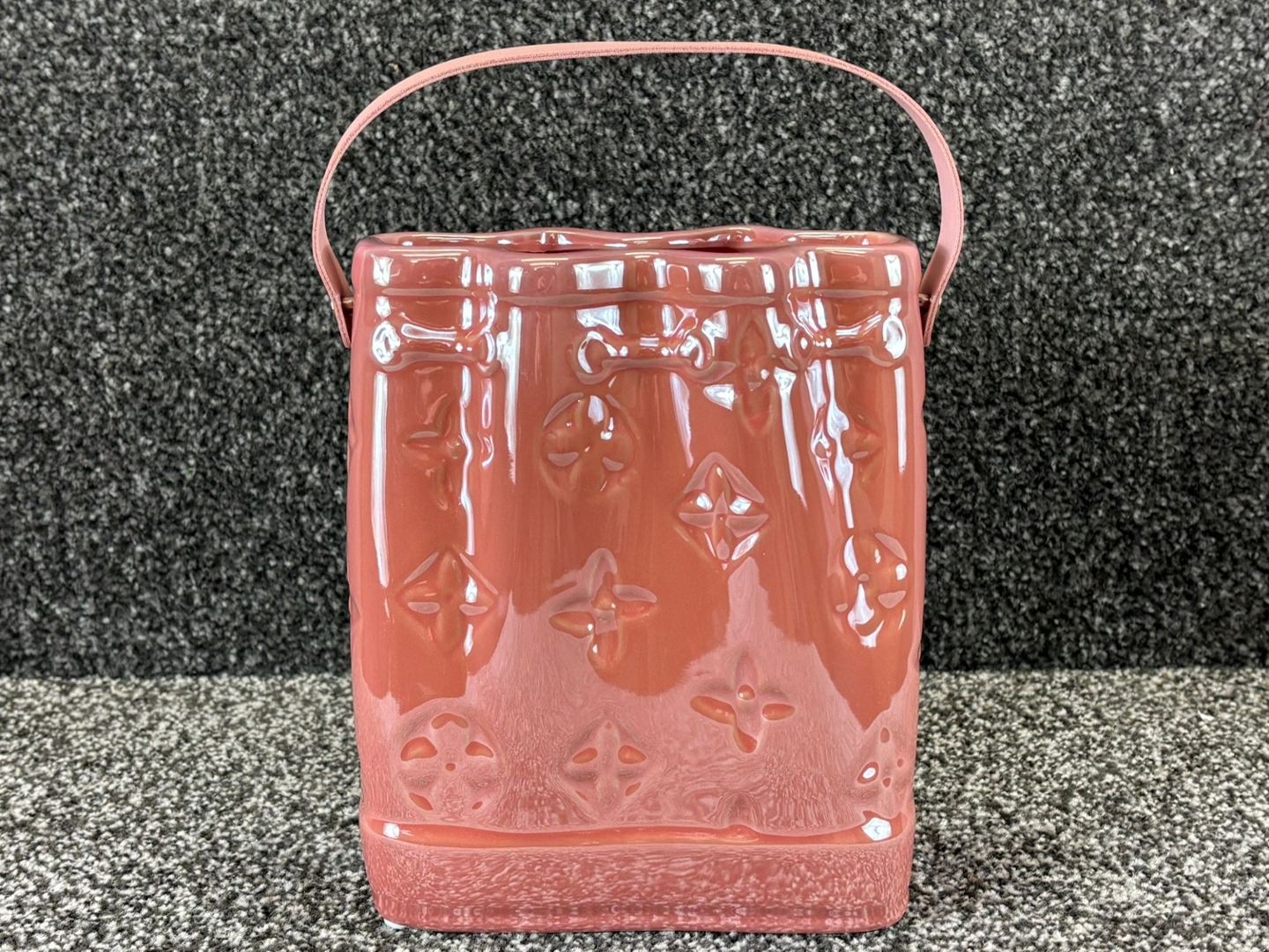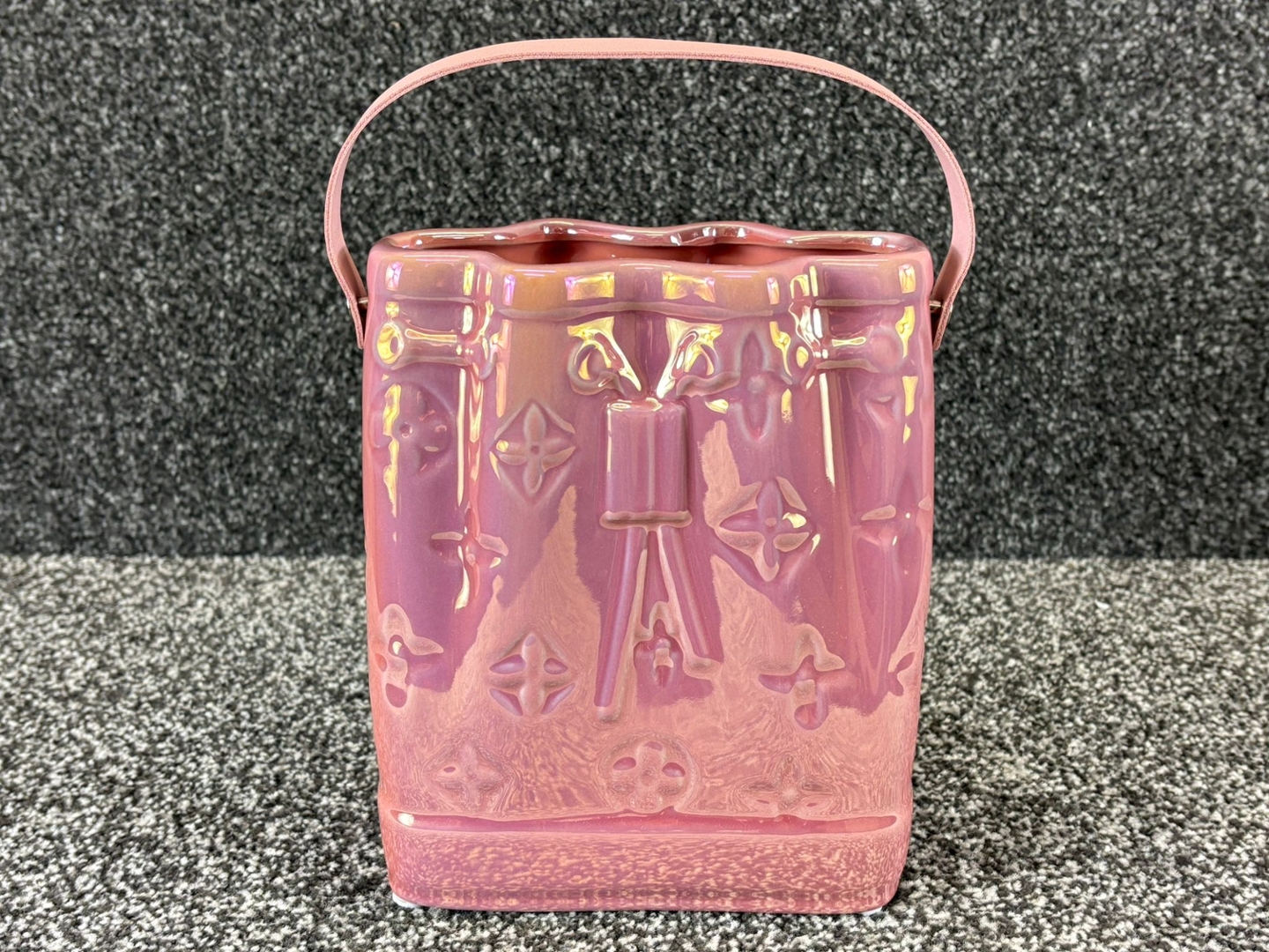 A Pink Ceramic Handbag Vase with a Pink Handle. Approx 20cm height, 15cm width, 8cm depth.