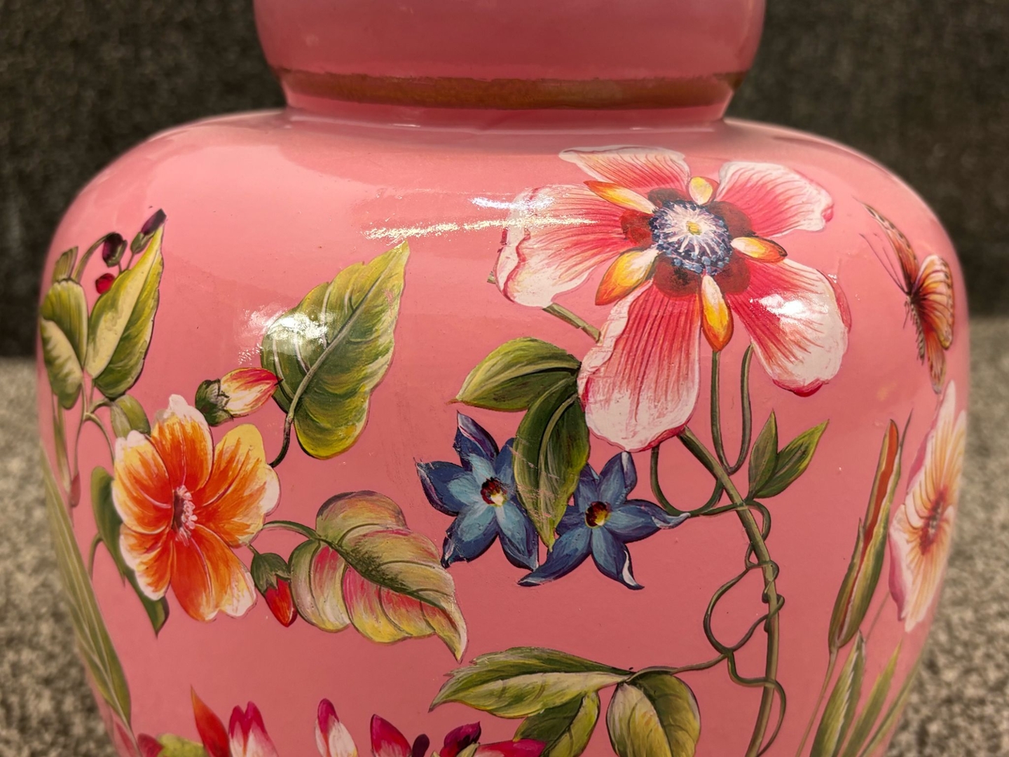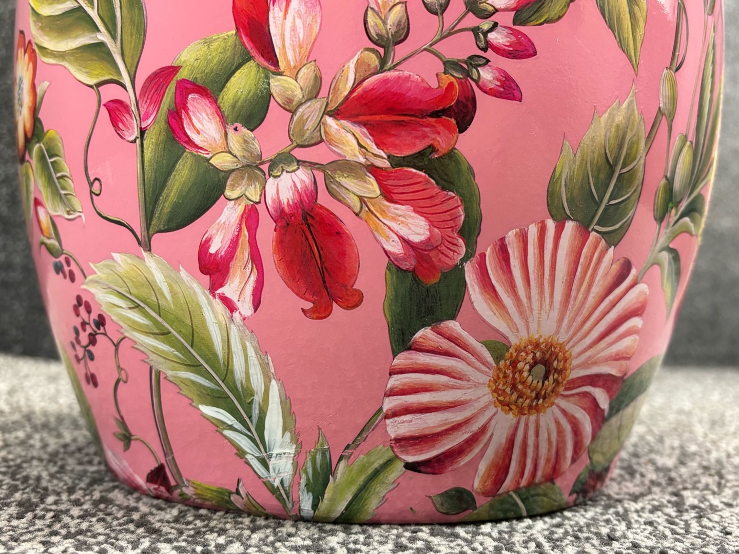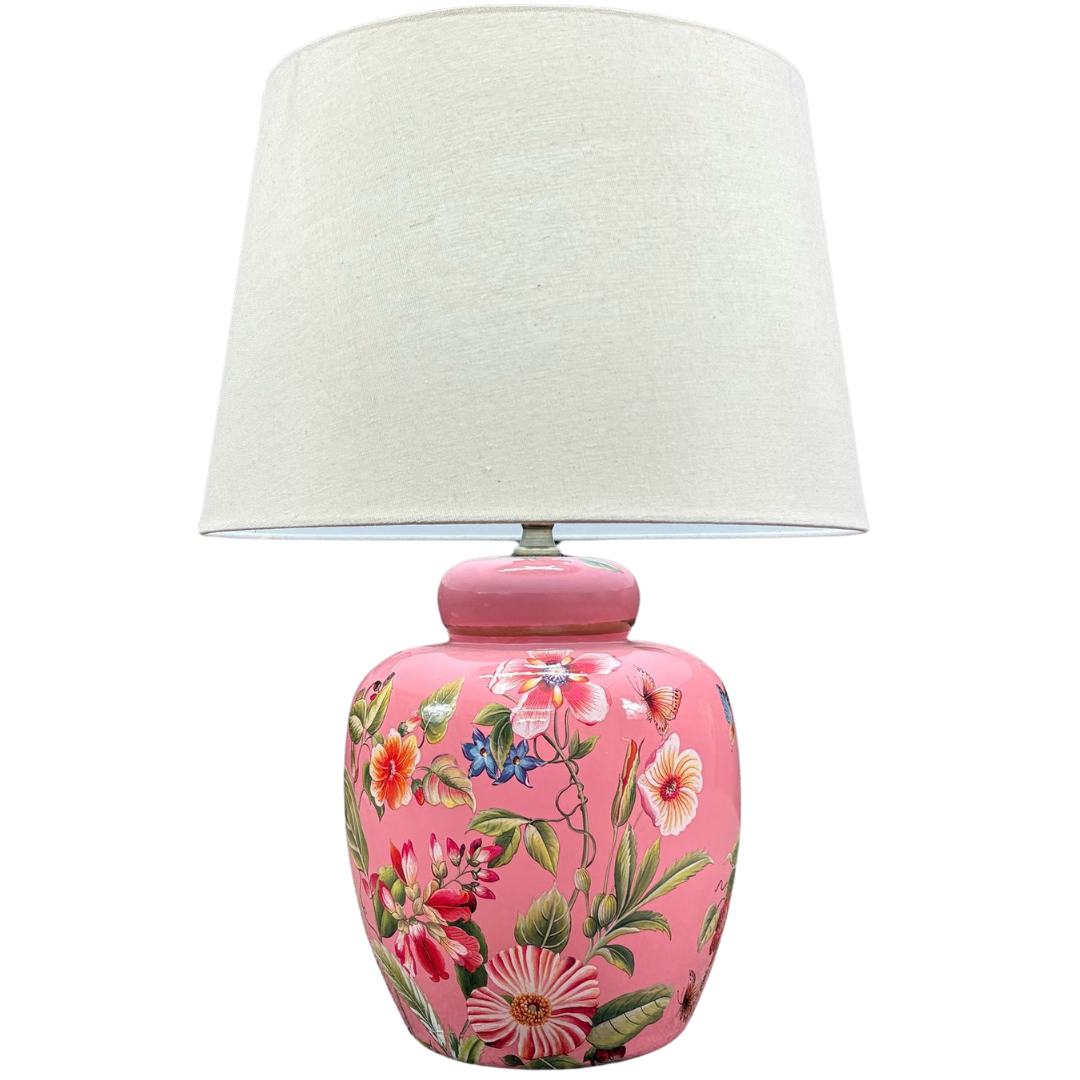 A pink flower design table lamp measuring approximately 50cm in height and 40cm in width, this charming piece brings together whimsical beauty and classic craftsmanship. The ceramic base is painted in a soft, vibrant pink and adorned with a stunning array of blooming florals and lush greenery, giving it a fresh, garden-inspired appeal.