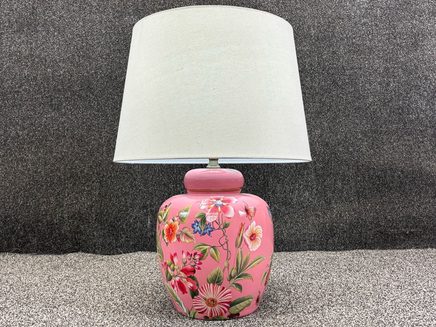 A Pink Flower Design Table Lamp with a white shade. Approx 50cm height, 40cm width.