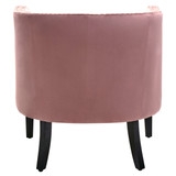 The generously padded seat cushion offers both comfort and support, making it ideal for a living room, bedroom, dressing area or reception space. Its compact yet impactful design allows it to complement both contemporary and classic décor schemes with ease. The sleek black legs provide a bold contrast to the soft pink upholstery, grounding the piece with a modern, stylish finish.