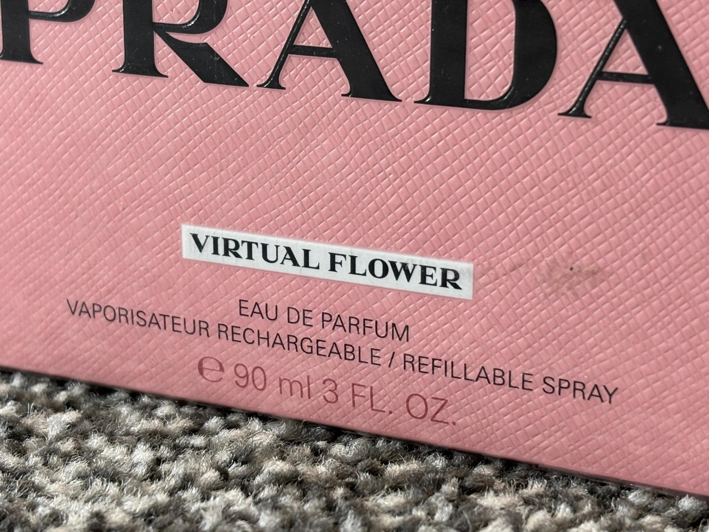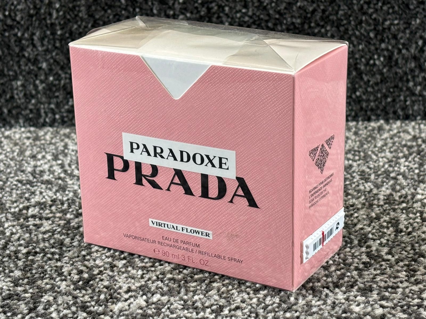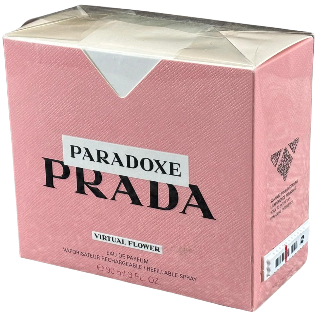 A 90ml bottle of Prada Paradoxe Virtual Flower Eau De Parfum, presented in its original presentation box and offering a fresh, contemporary interpretation within the Paradoxe fragrance line. This modern release reflects Prada’s innovative approach to femininity, blending elegance with a light, forward-looking character.