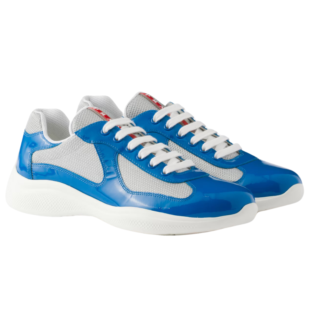This pair showcases smooth white leather paired with contrasting blue leather overlays, giving a bold yet versatile look suitable for both casual and smart-casual wear. The signature red Prada tab on the tongue adds an unmistakable touch of prestige, while the lightweight rubber sole ensures comfort and durability for everyday use.