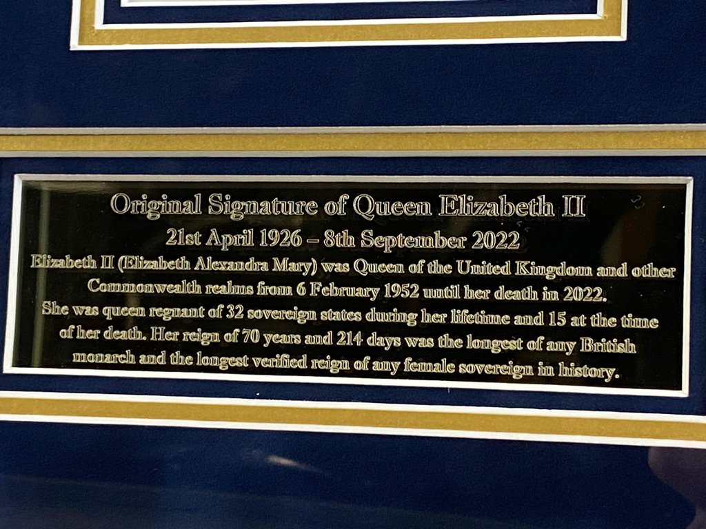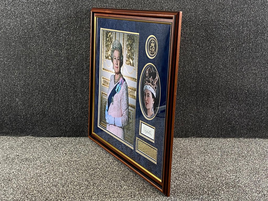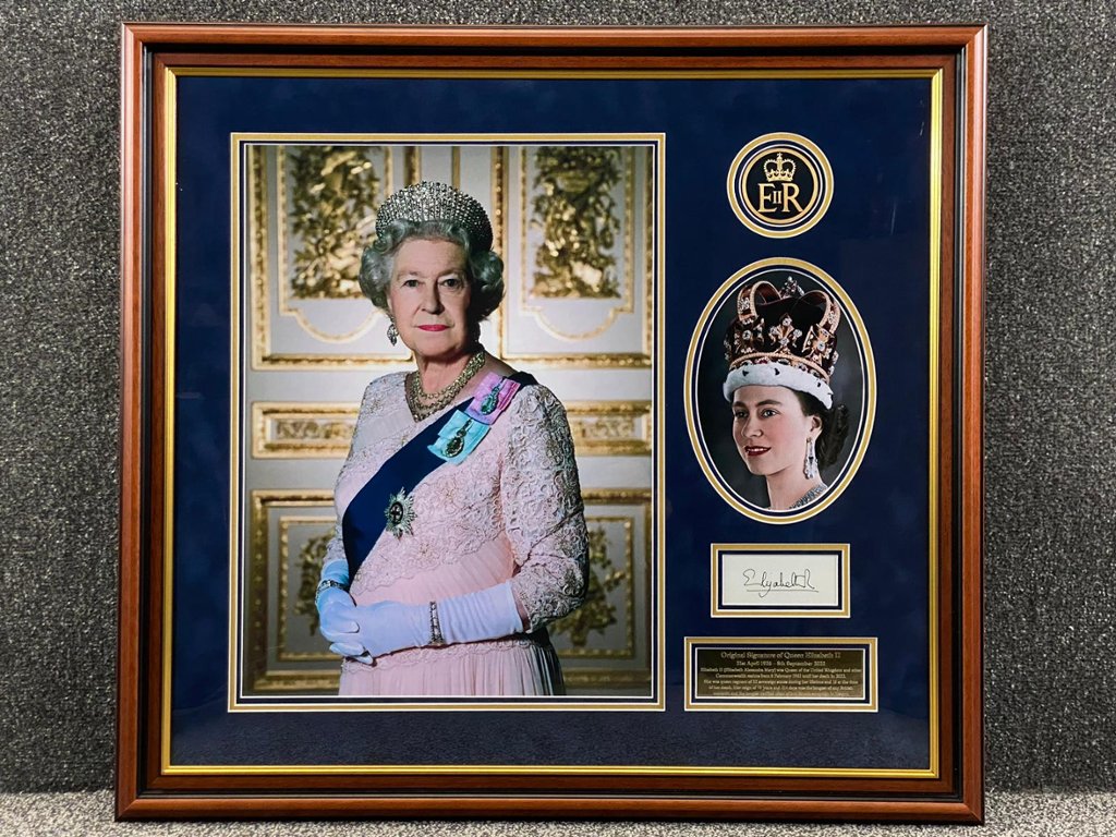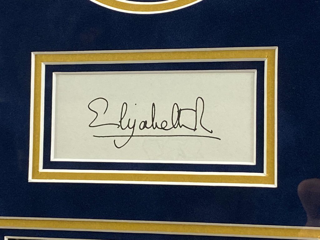 A signed & authenticated Queen Elizabeth II Picture Montage in a presentation frame. Approx 28" height, 31" width. (Memorabilia)