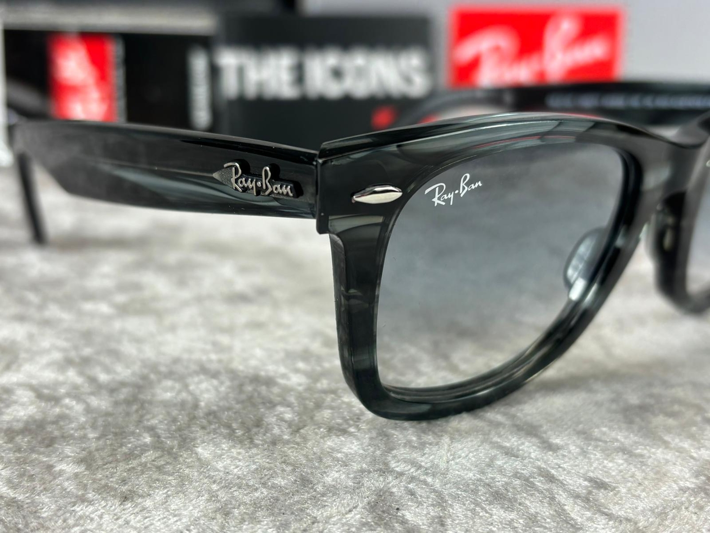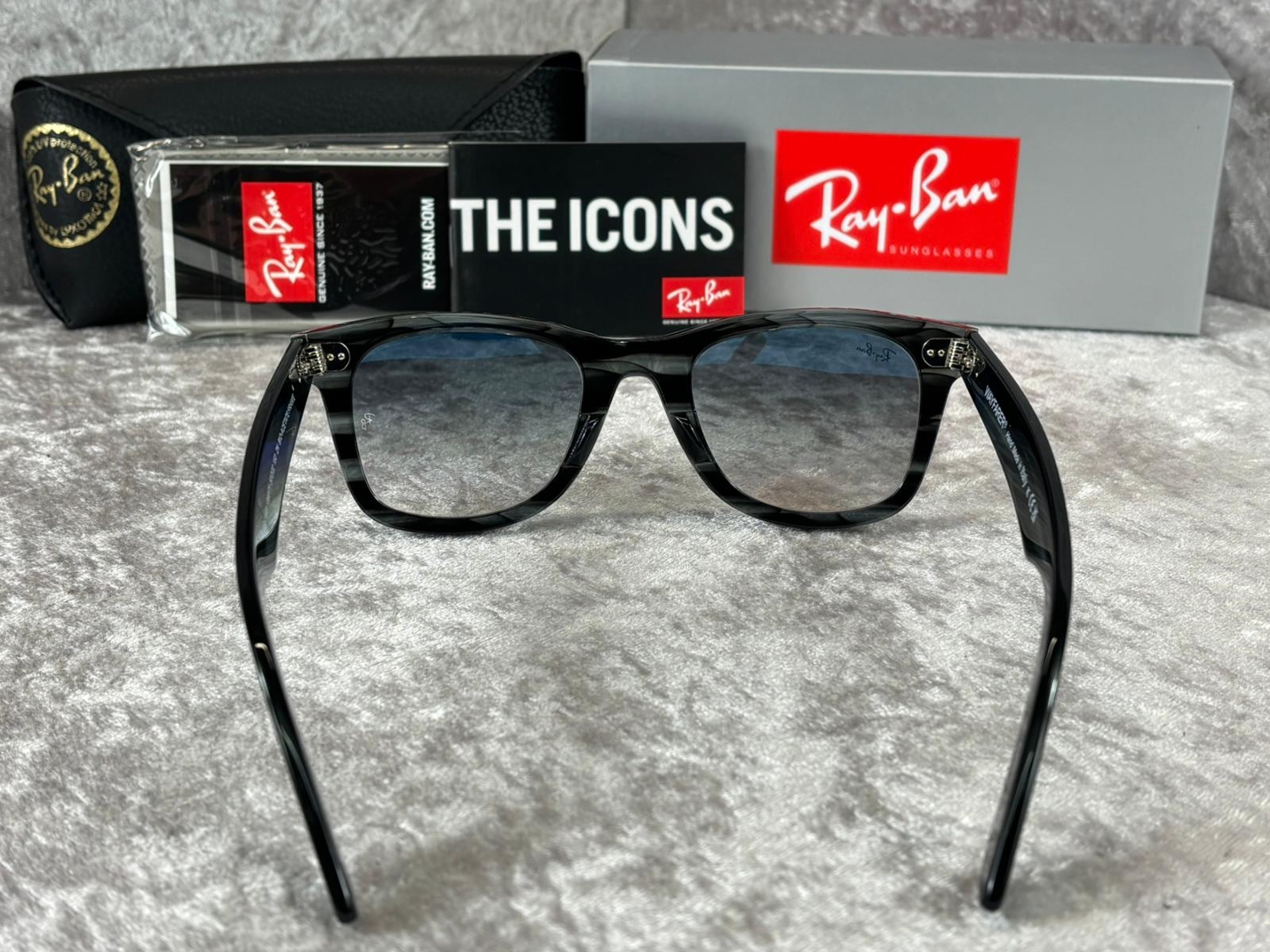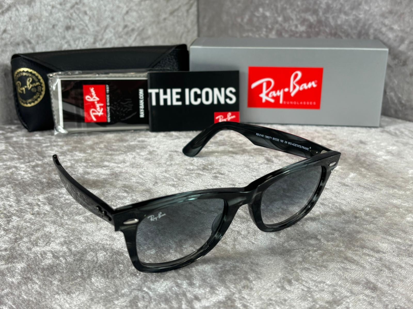 A brand new, unused and boxed pair of Ray-Ban RB2140 136071 sunglasses, presented in a sleek striped grey finish that offers a modern and versatile take on a timeless silhouette. This refined colourway enhances the iconic Wayfarer design, delivering understated character while remaining effortlessly wearable across a range of styles and occasions.